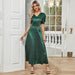 Vestido casual de cintura alta con cuello en V y mangas abullonadas en color liso