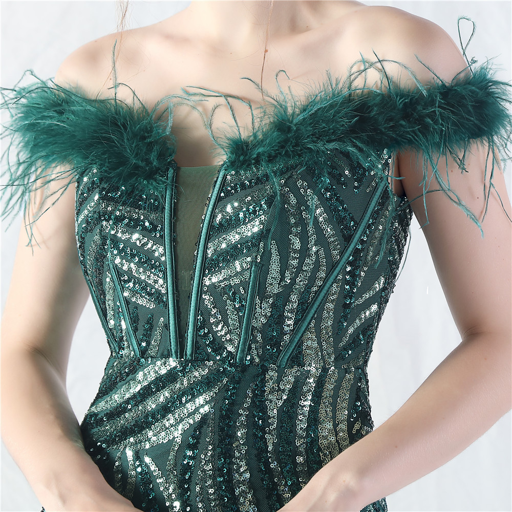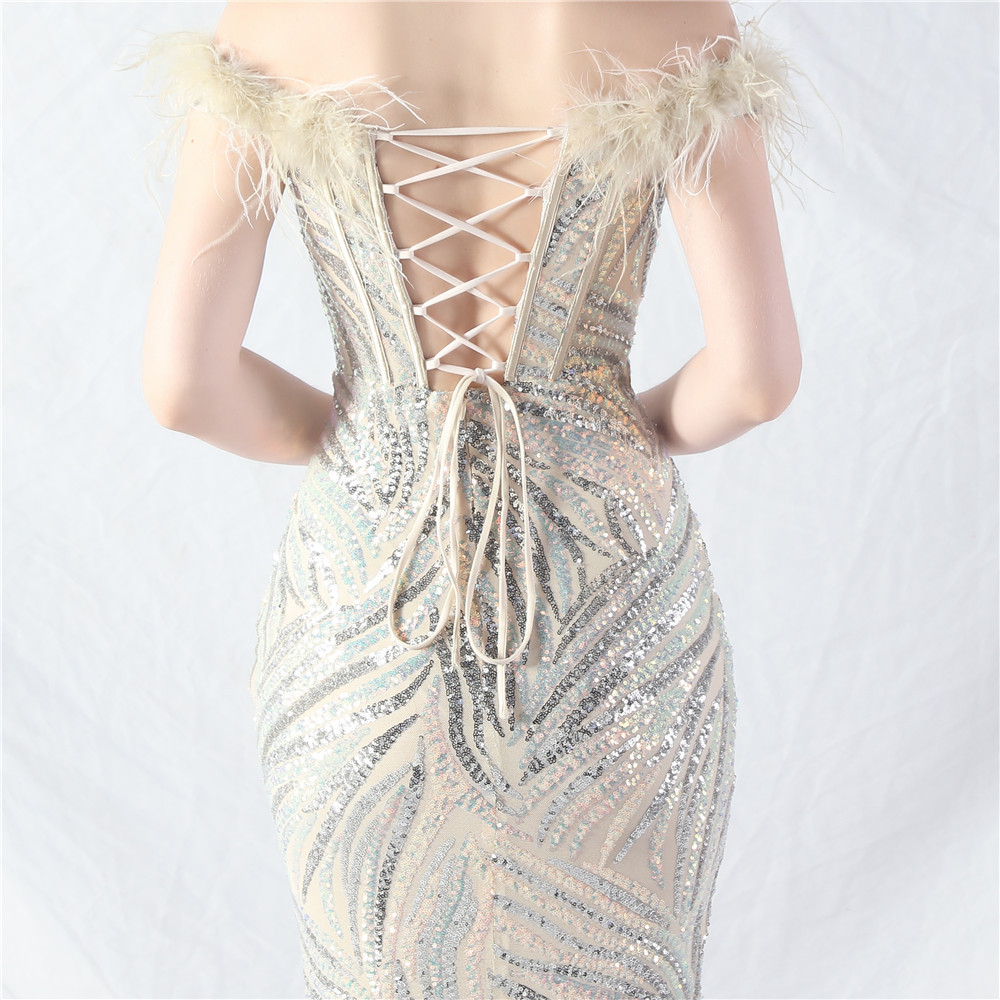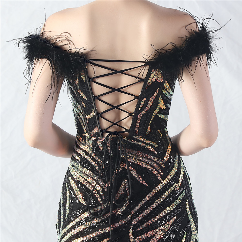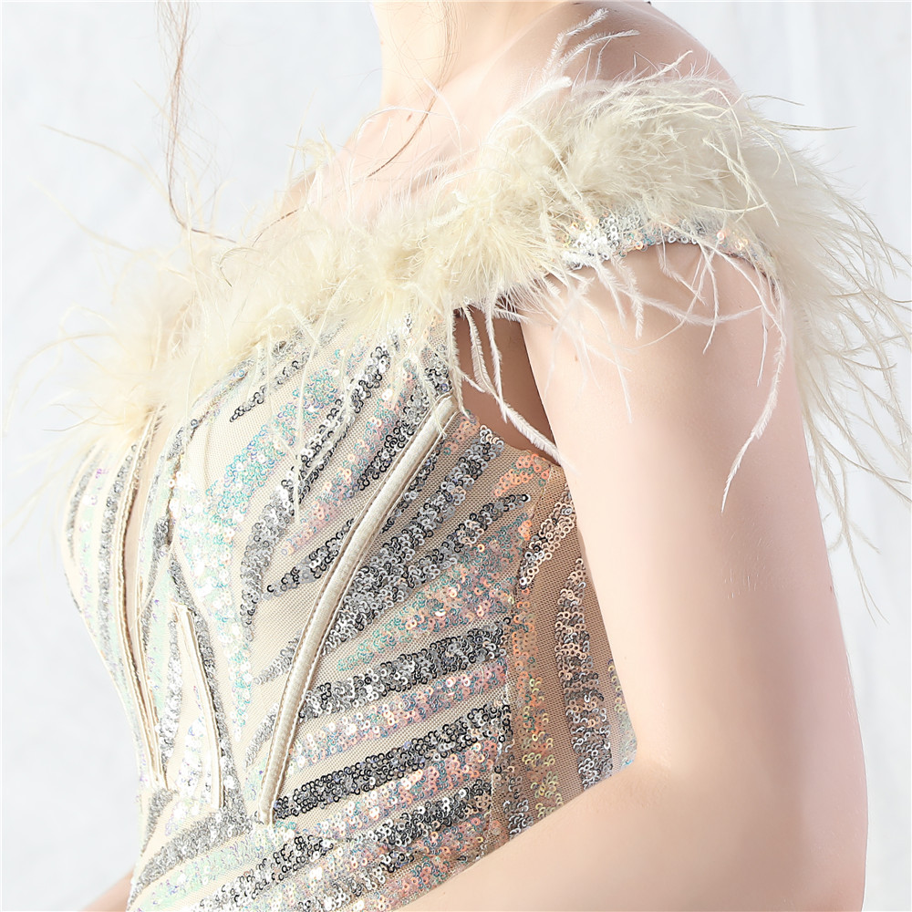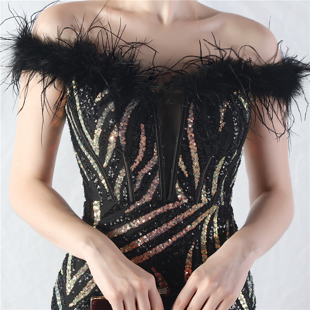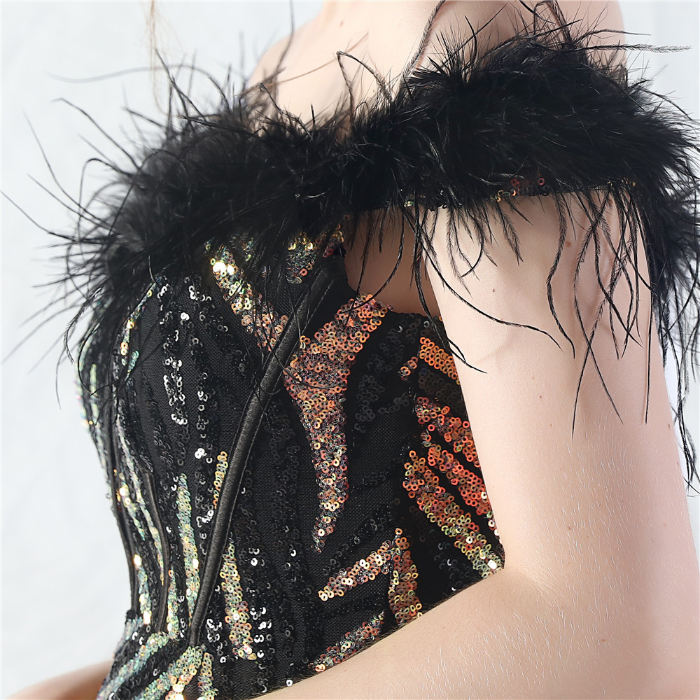 Vestido de noche de alta gama con lentejuelas y plumas de avestruz, con corsé y chaleco ajustado a la cintura.