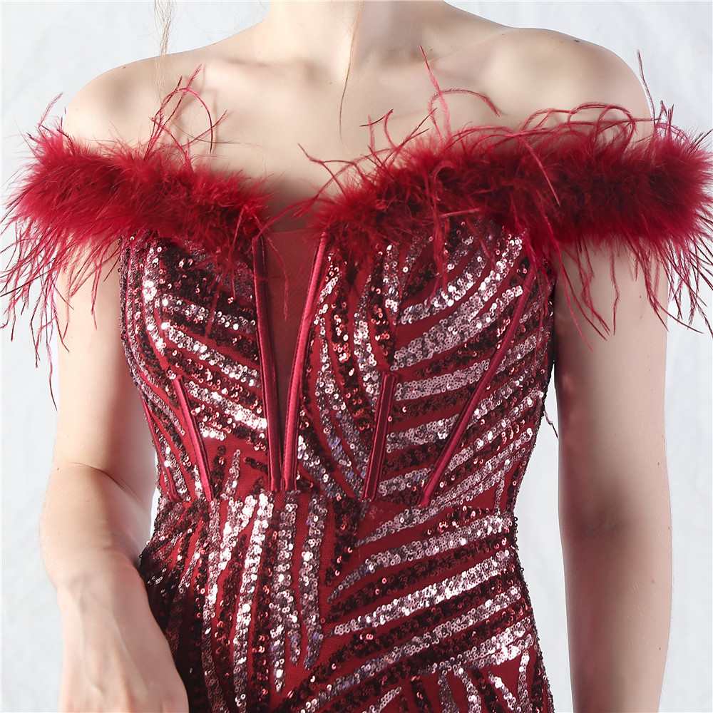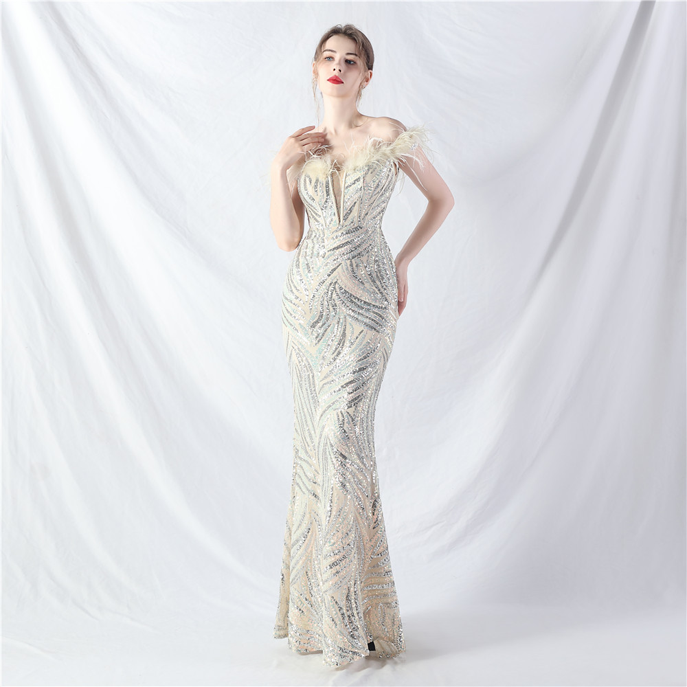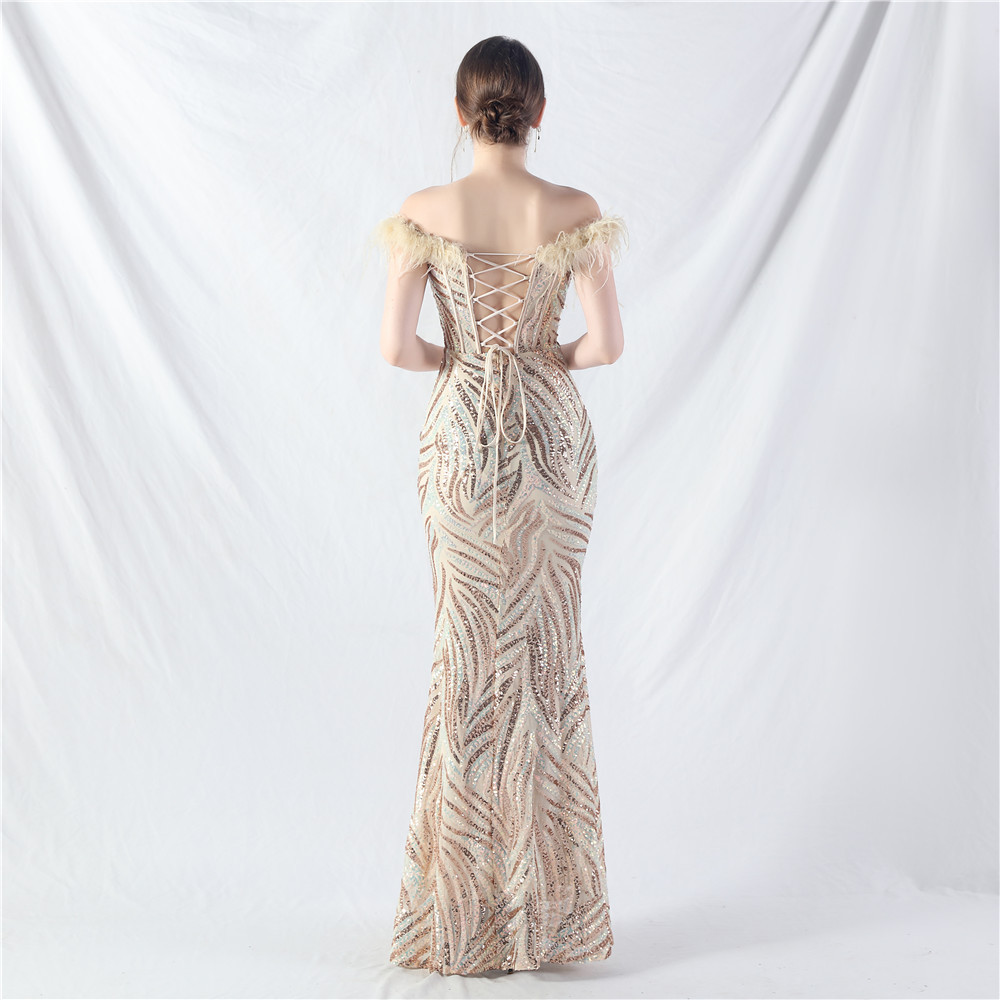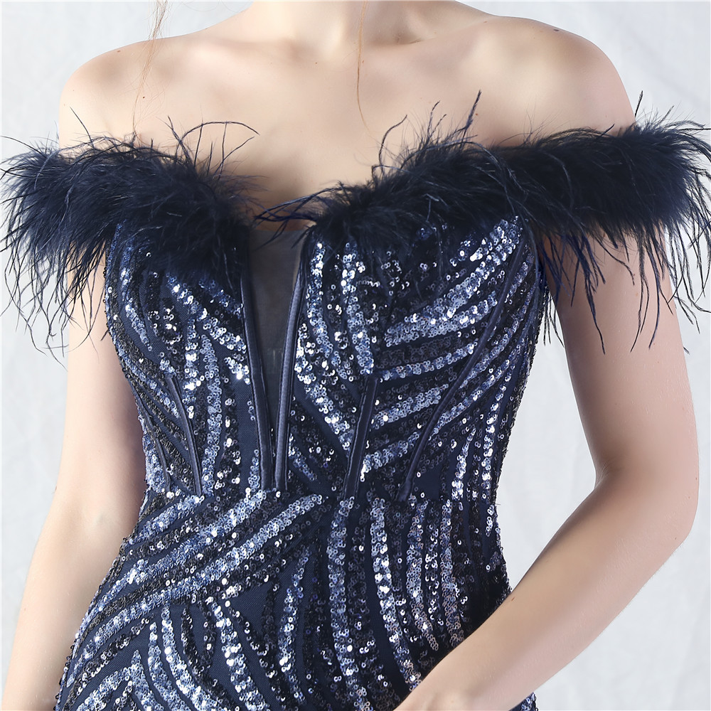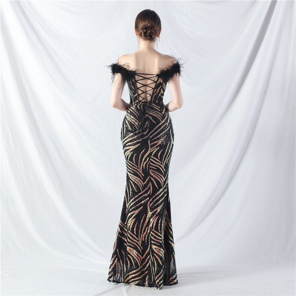 Vestido de noche de alta gama con lentejuelas y plumas de avestruz, con corsé y chaleco ajustado a la cintura.