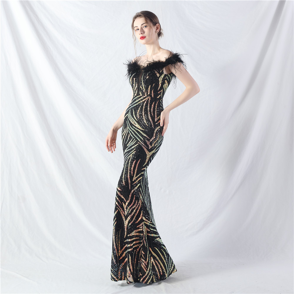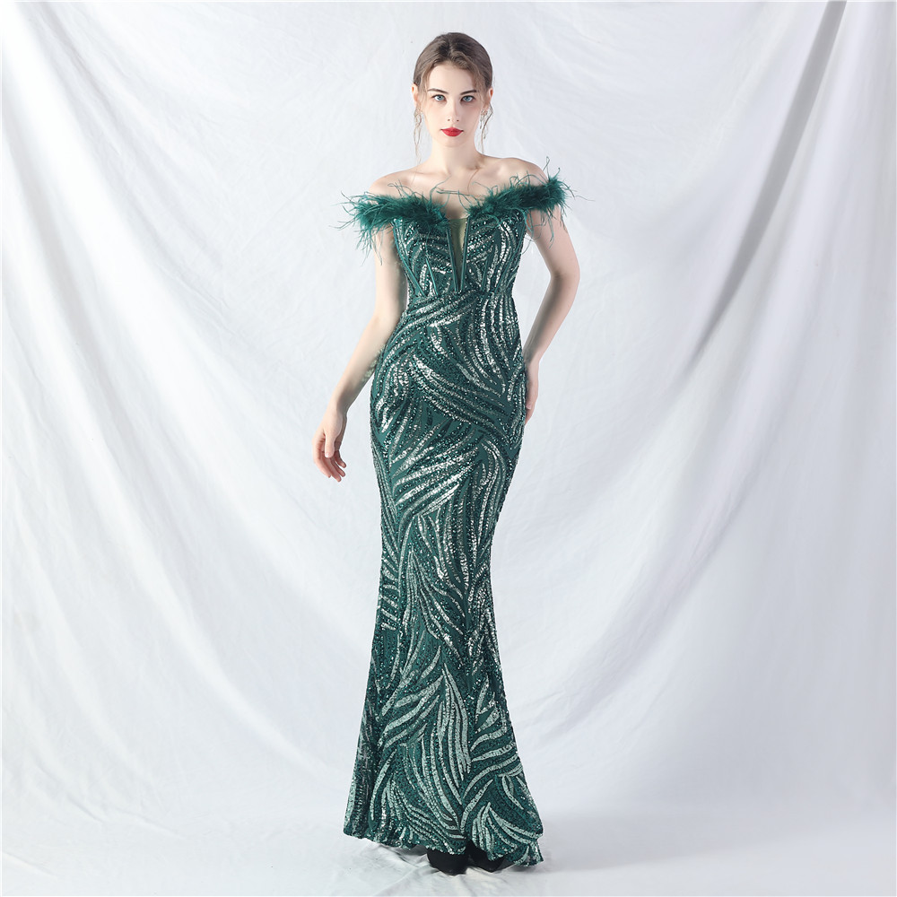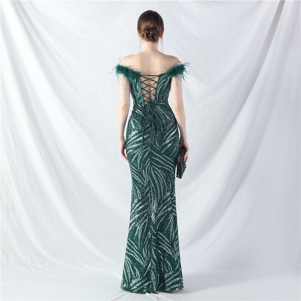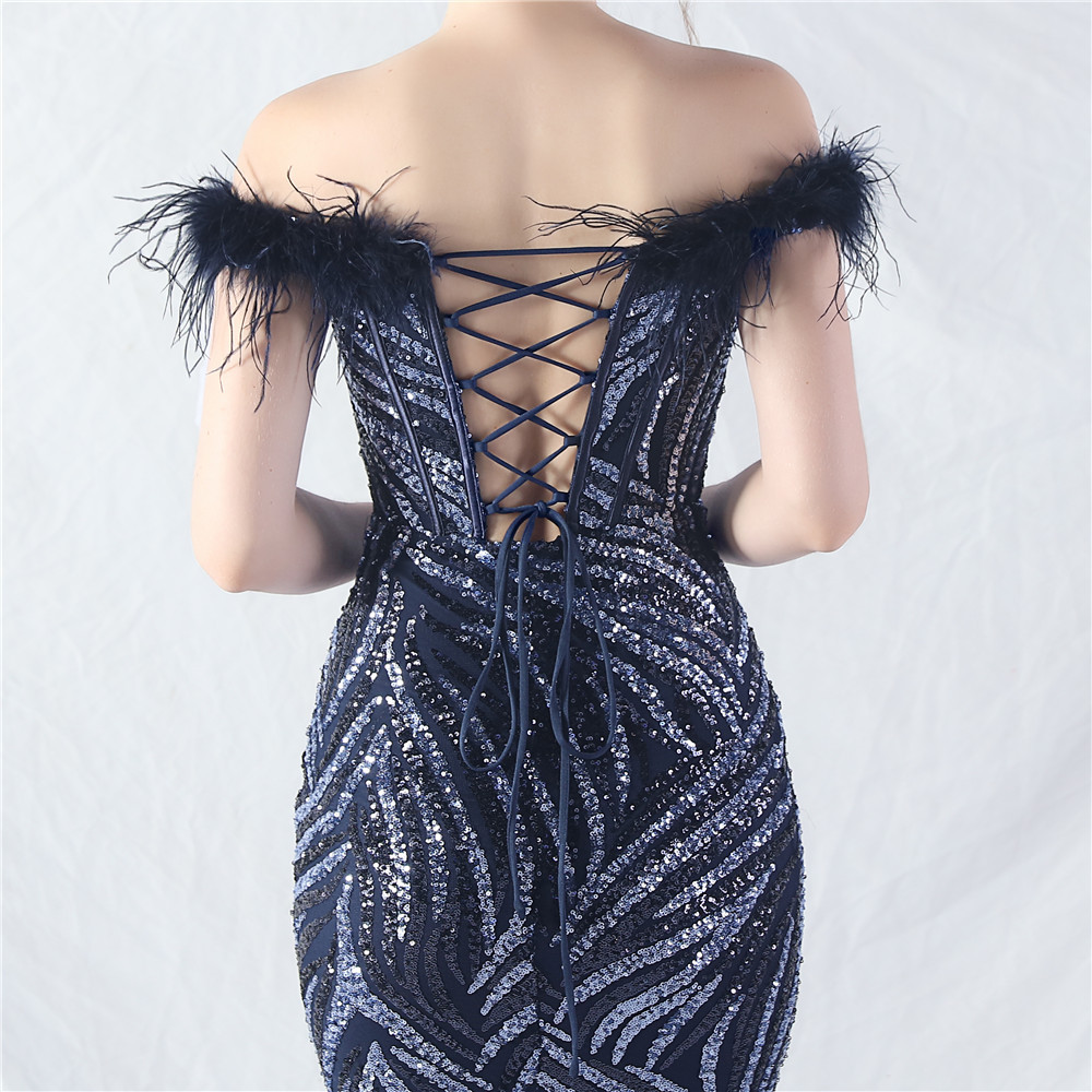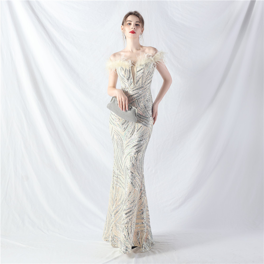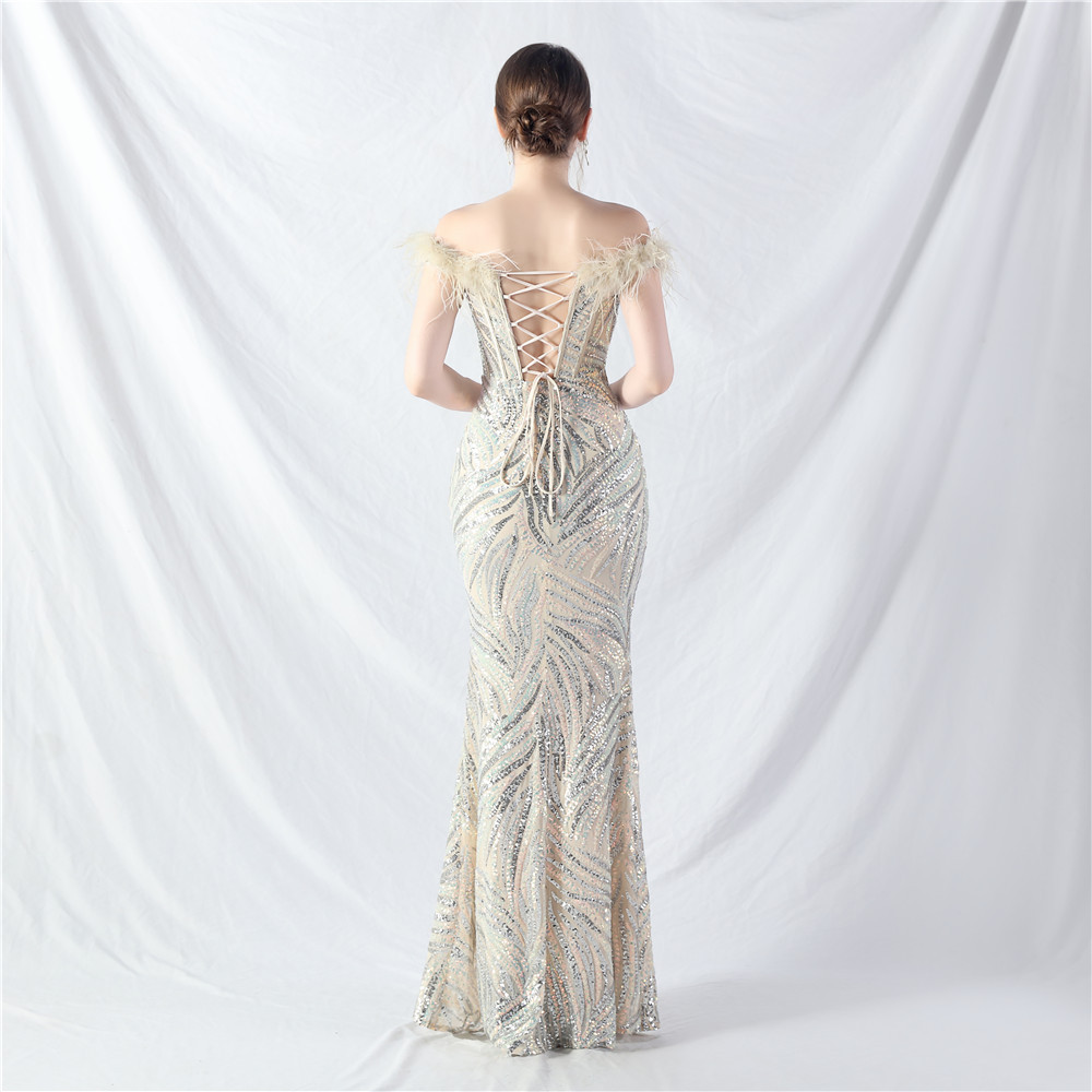 Vestido de noche de alta gama con lentejuelas y plumas de avestruz, con corsé y chaleco ajustado a la cintura.