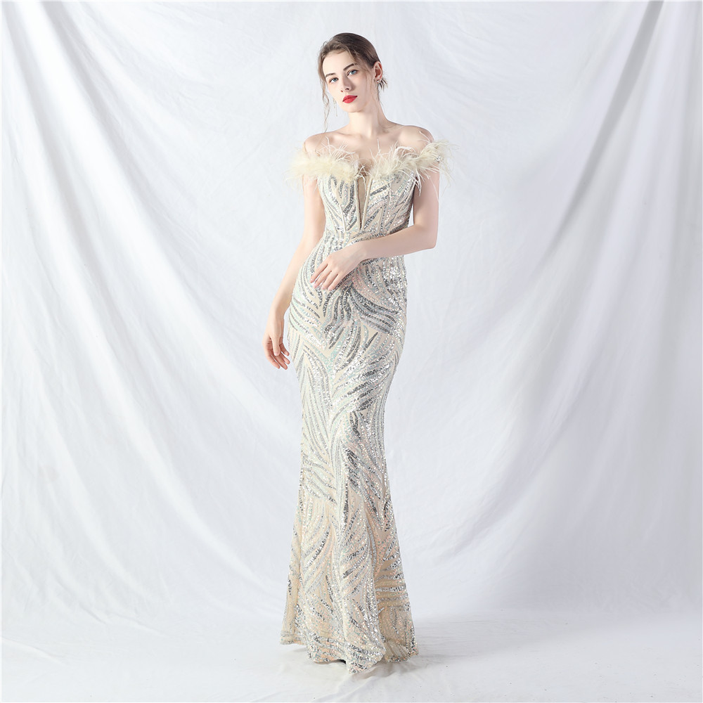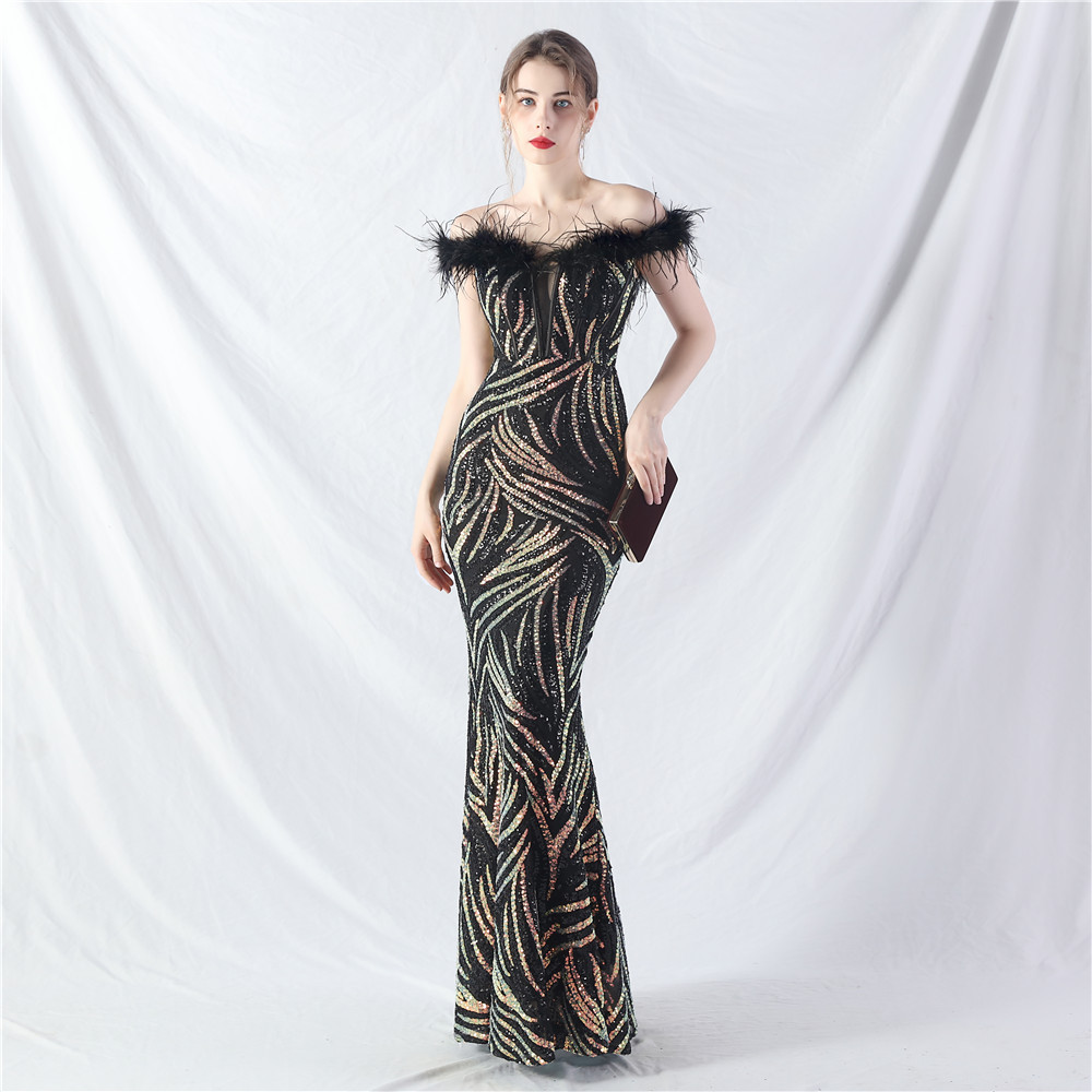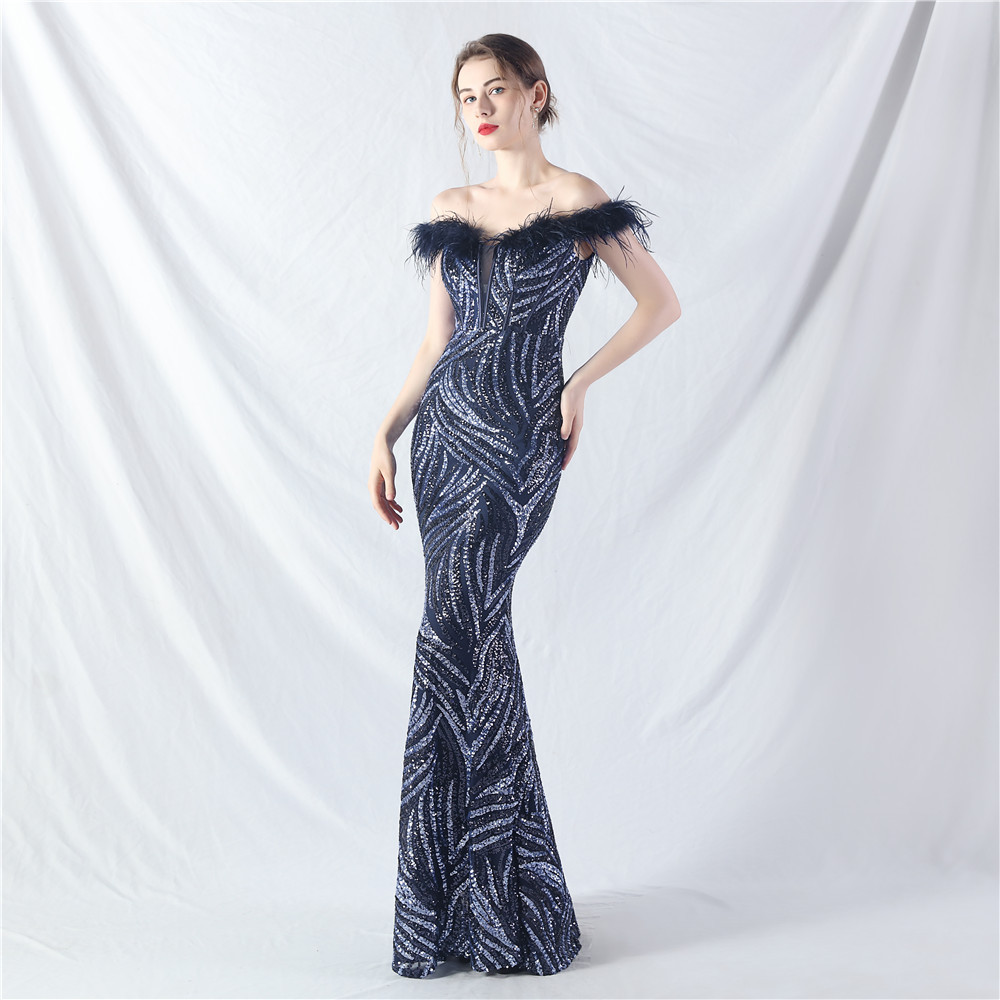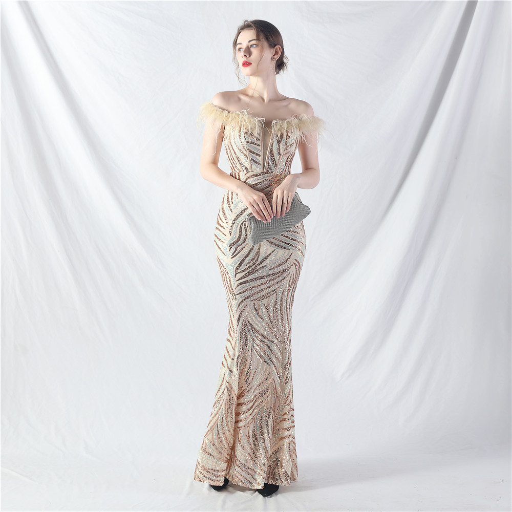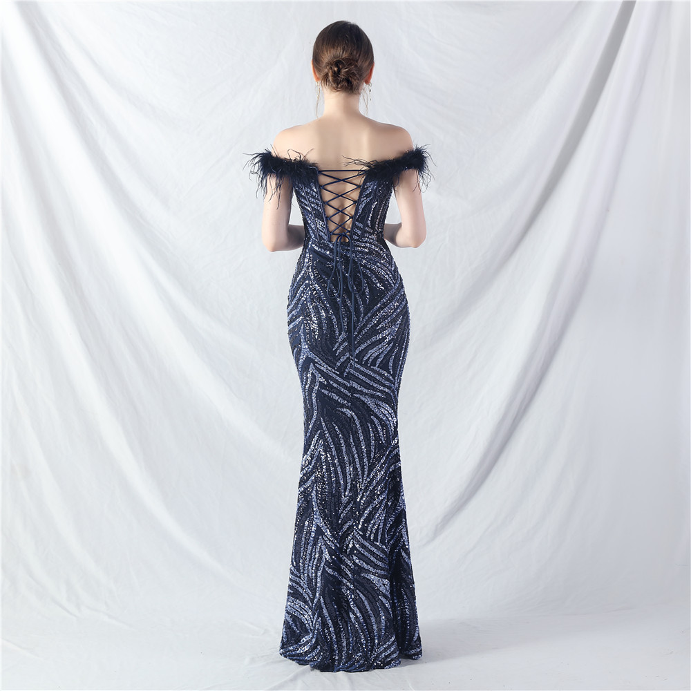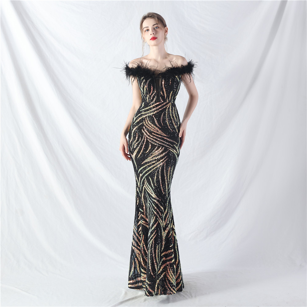 Vestido de noche de alta gama con lentejuelas y plumas de avestruz, con corsé y chaleco ajustado a la cintura.