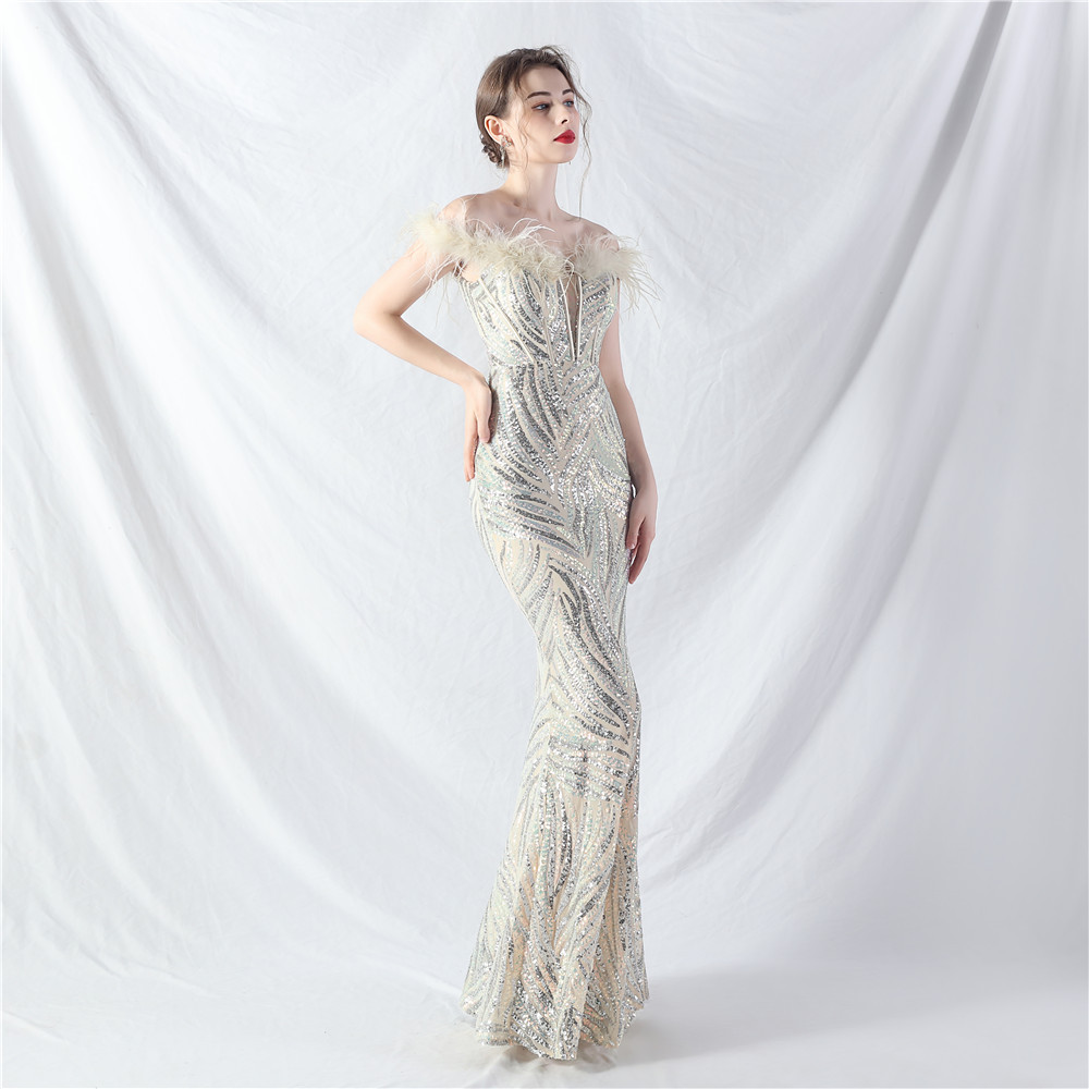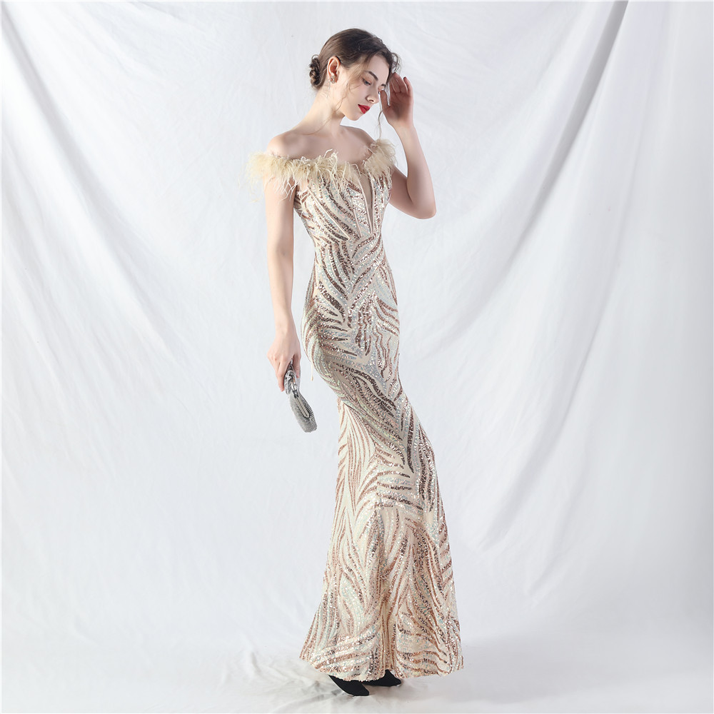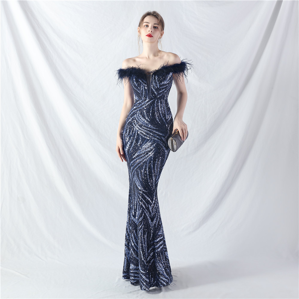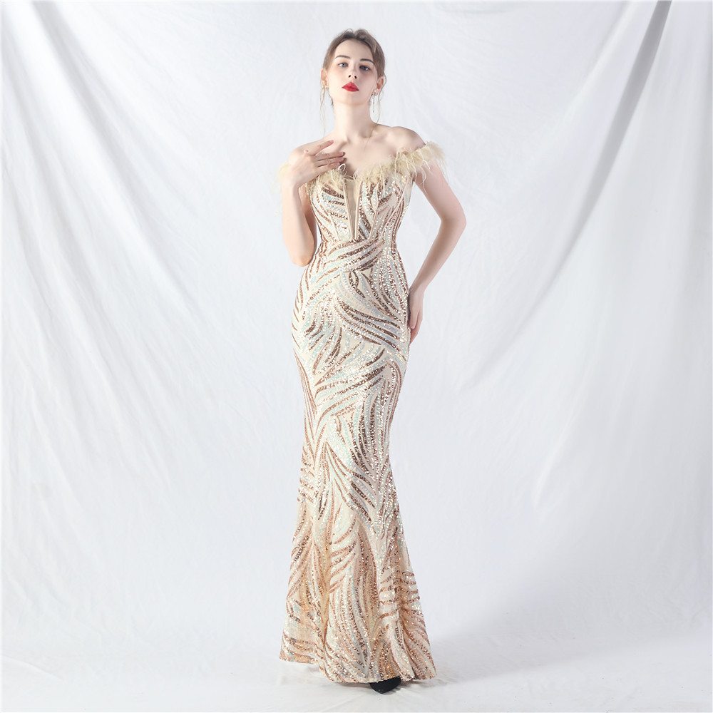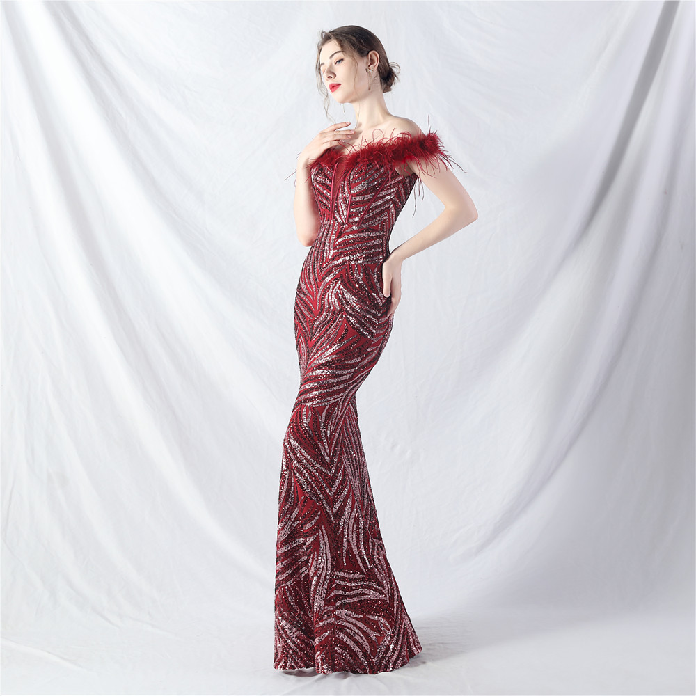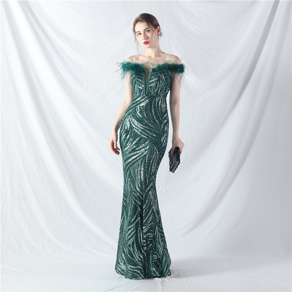 Vestido de noche de alta gama con lentejuelas y plumas de avestruz, con corsé y chaleco ajustado a la cintura.