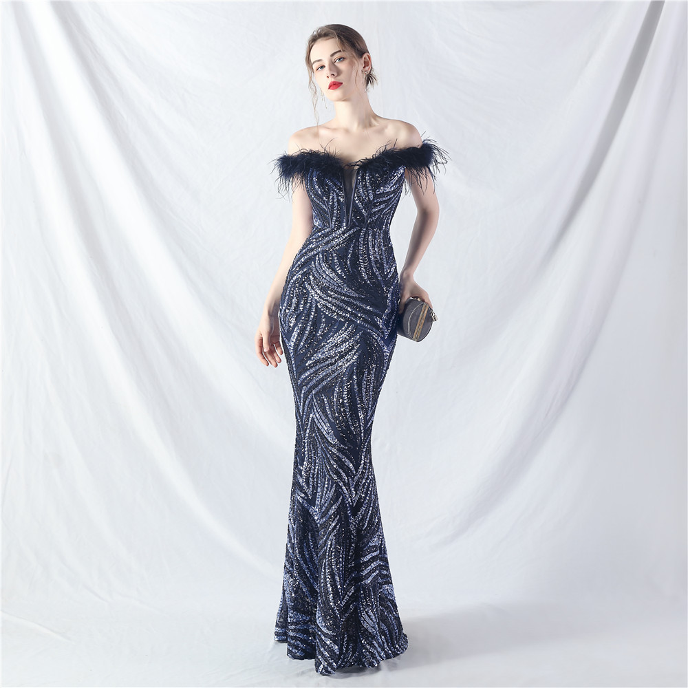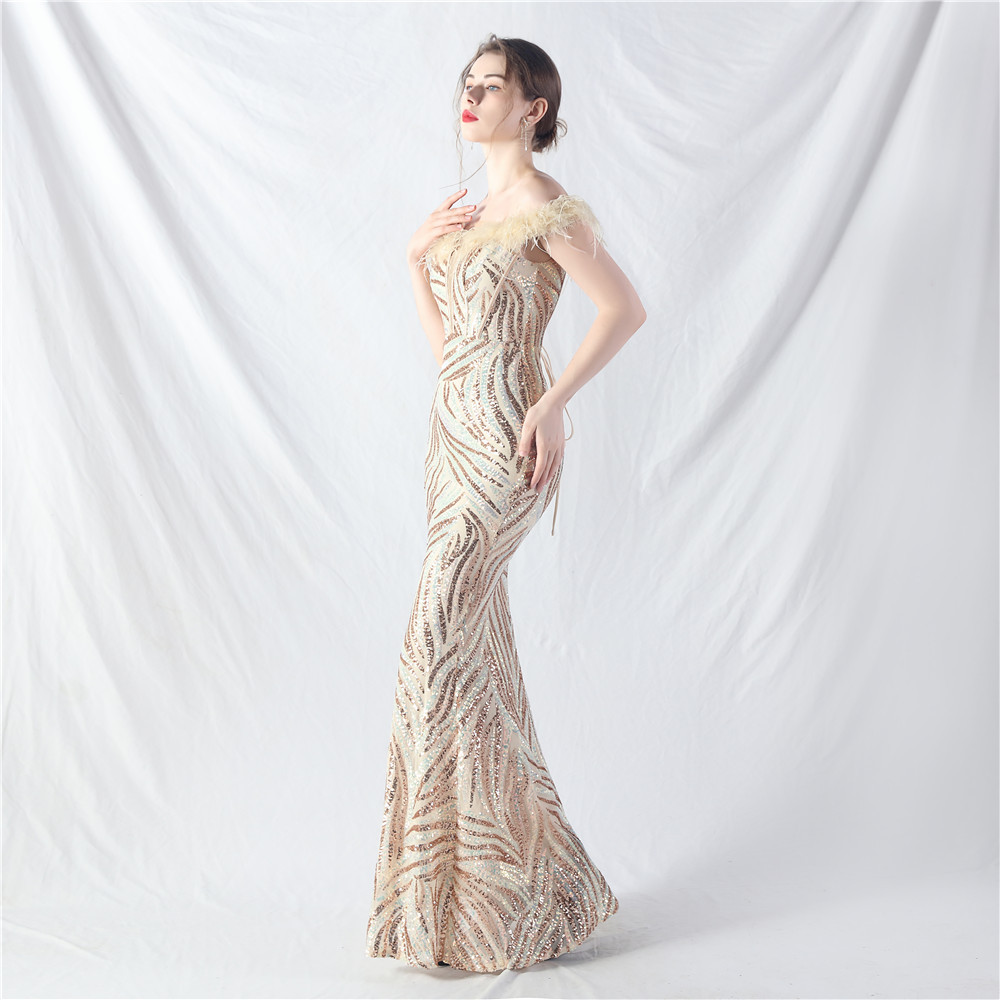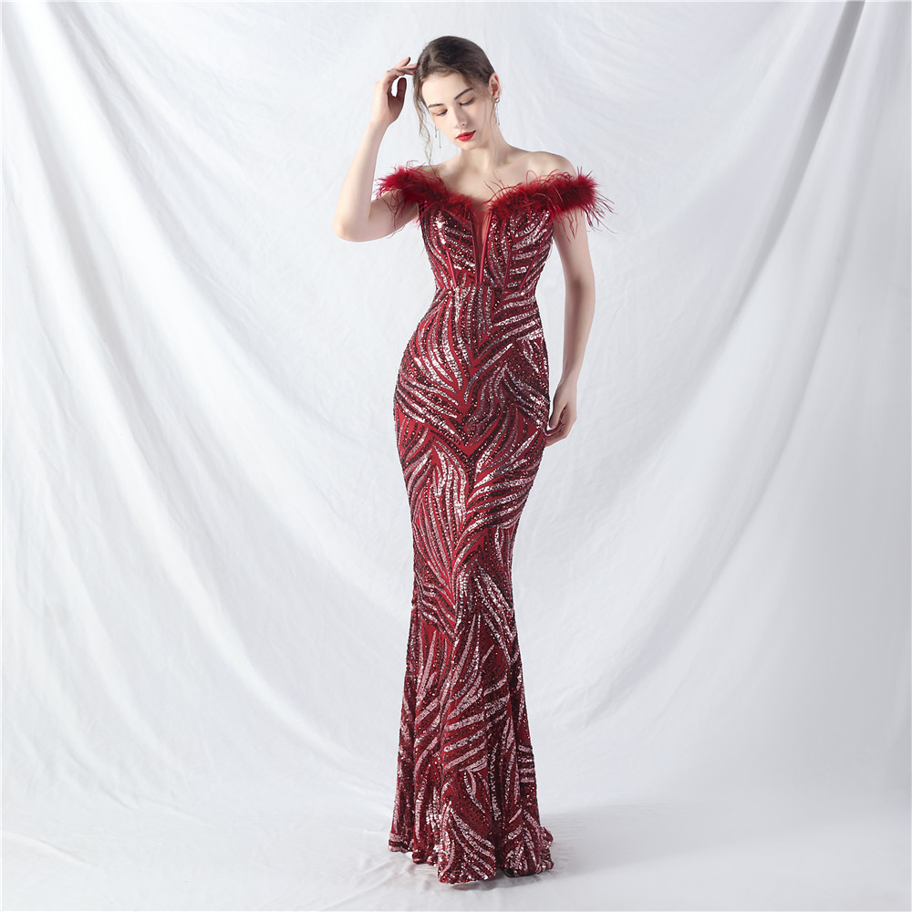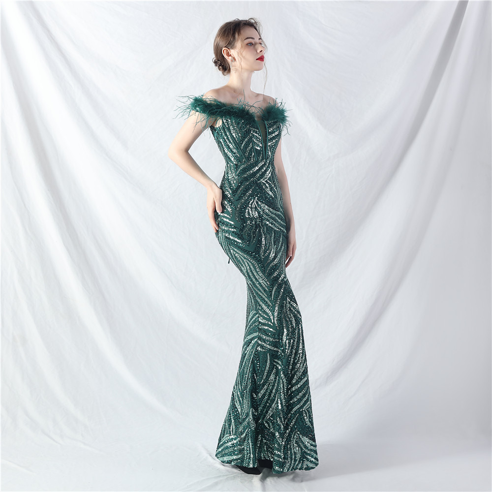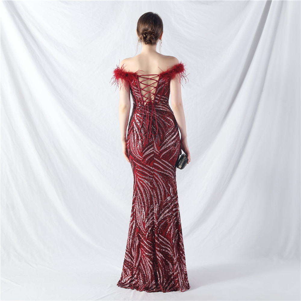 Vestido de noche de alta gama con lentejuelas y plumas de avestruz, con corsé y chaleco ajustado a la cintura.