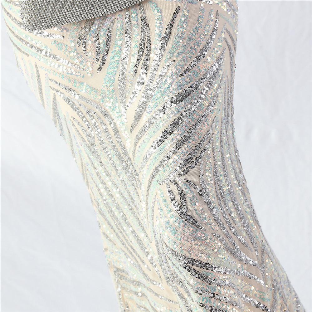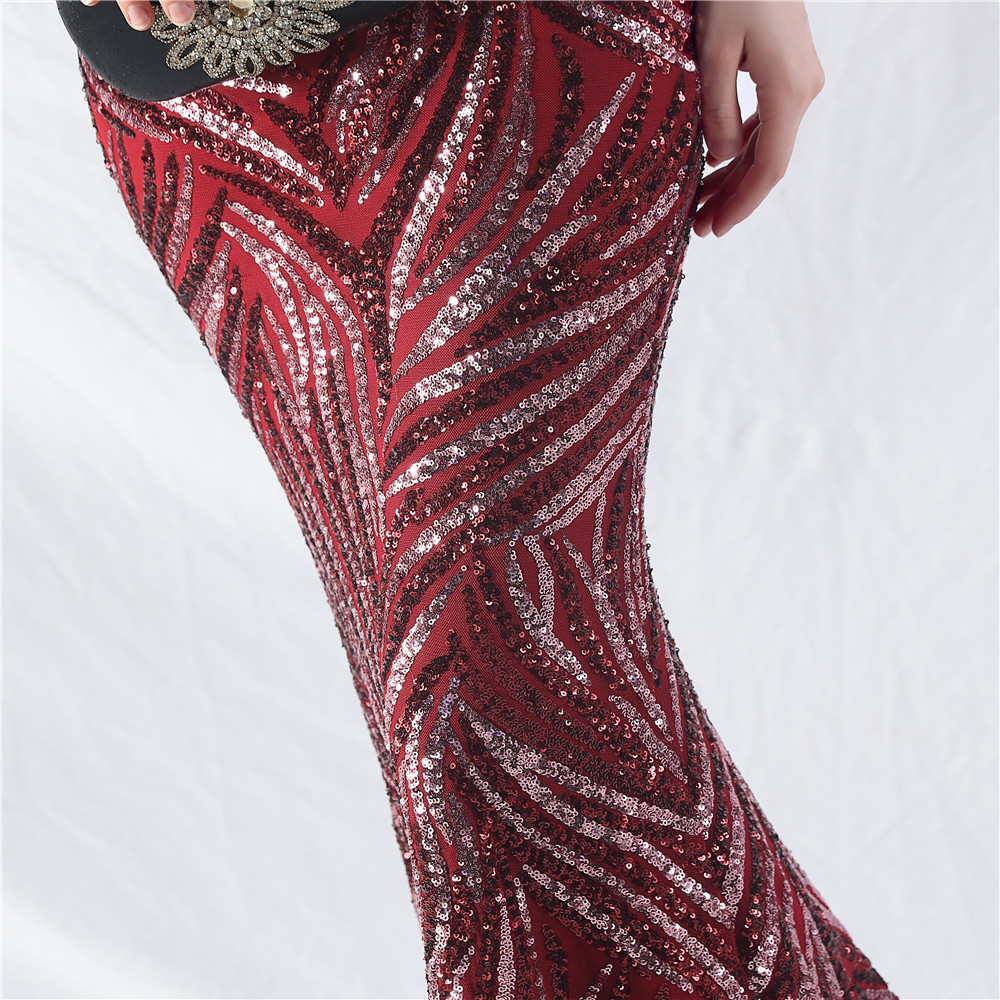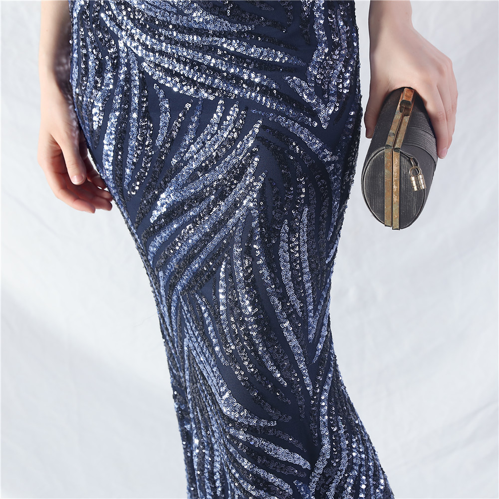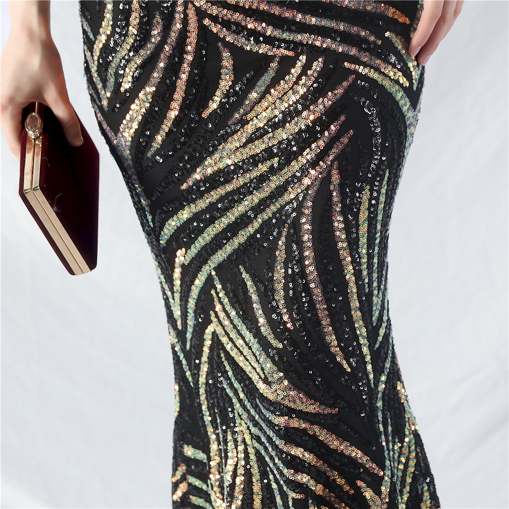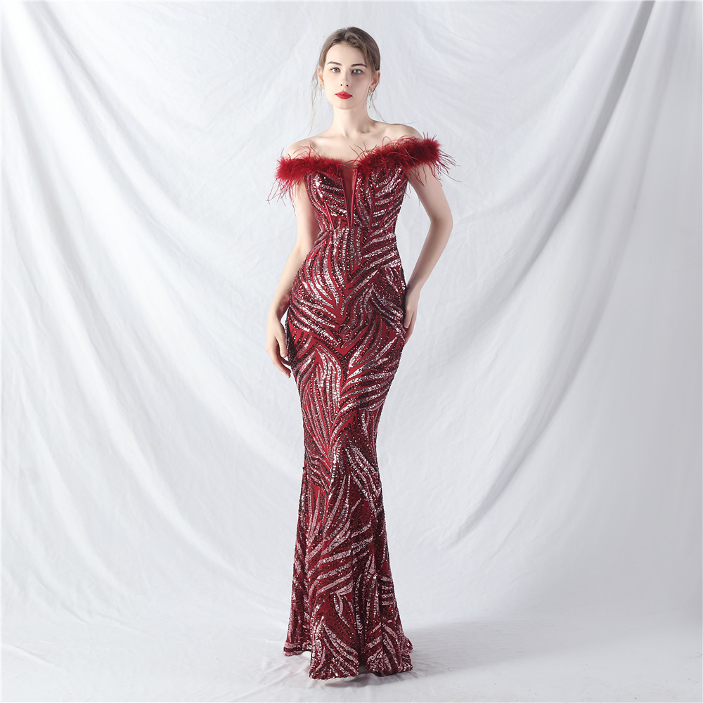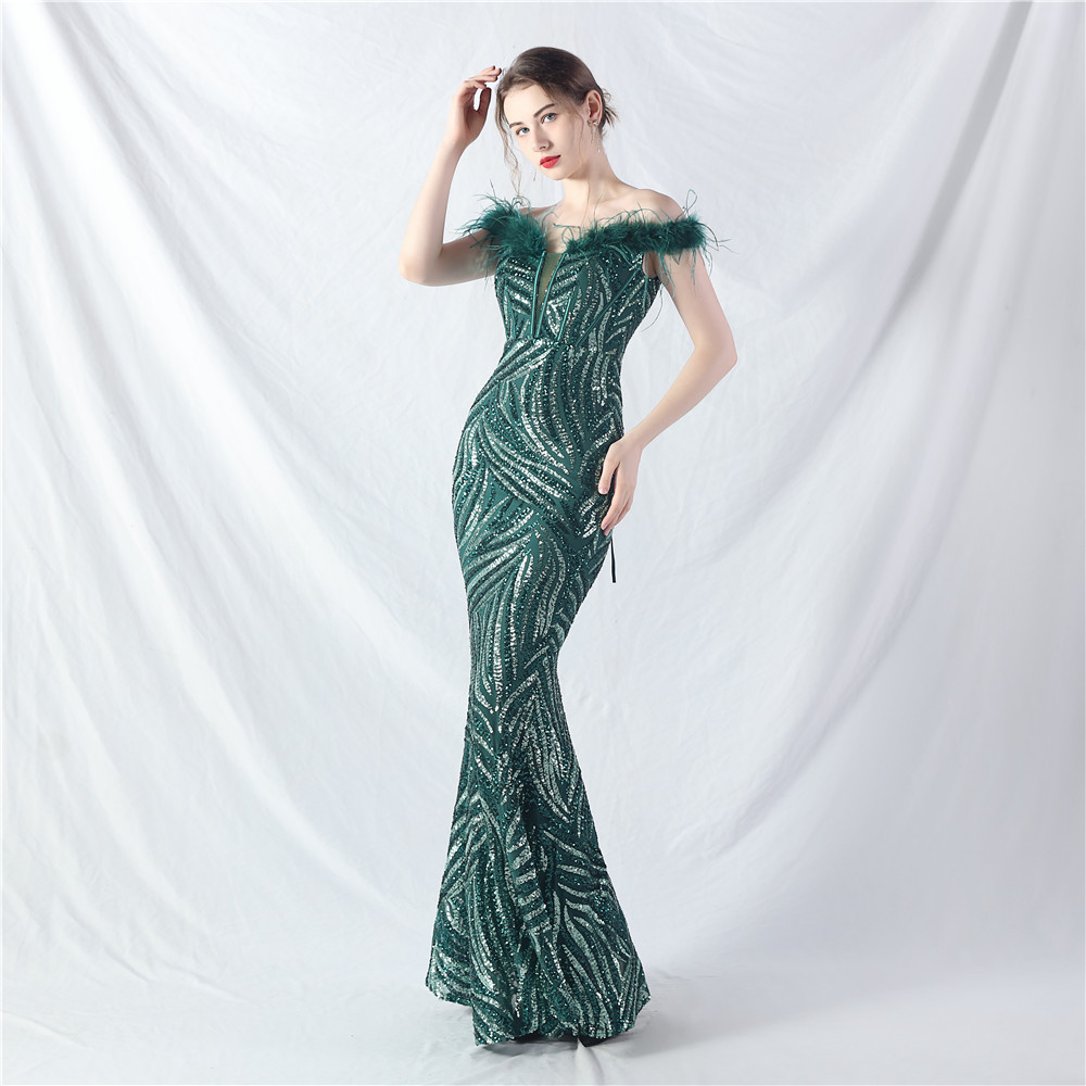 Vestido de noche de alta gama con lentejuelas y plumas de avestruz, con corsé y chaleco ajustado a la cintura.