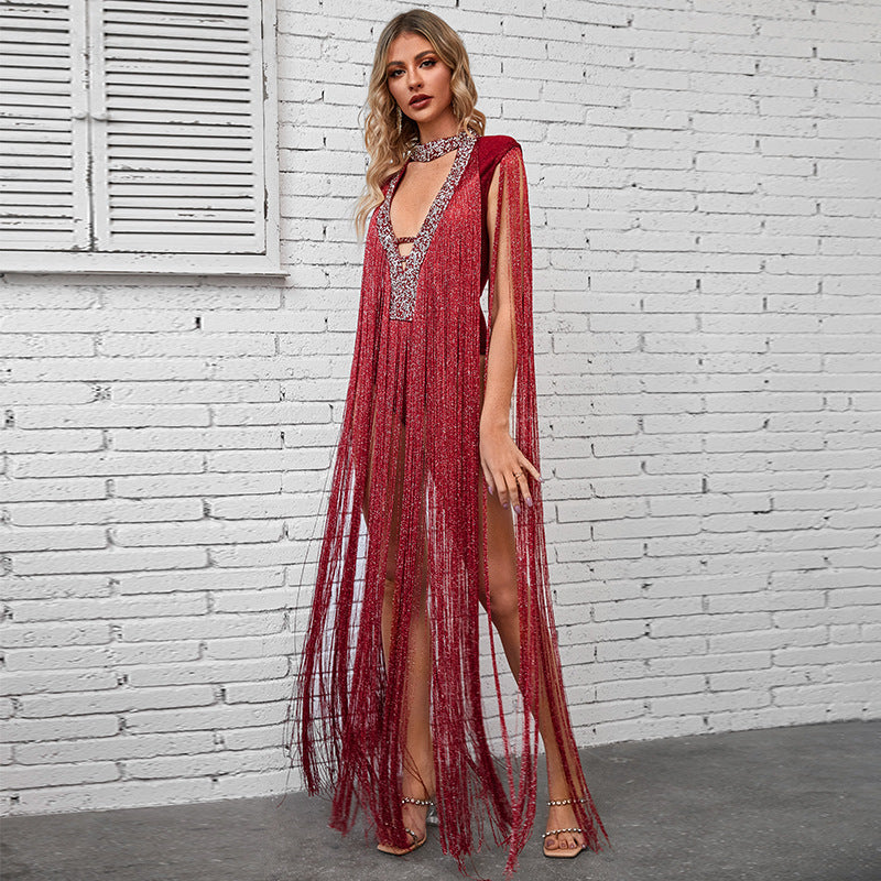 Vestido de fiesta de lujo con escote en V profundo y borlas de diamantes de imitación, vestido de alta gama para cenas y espectáculos