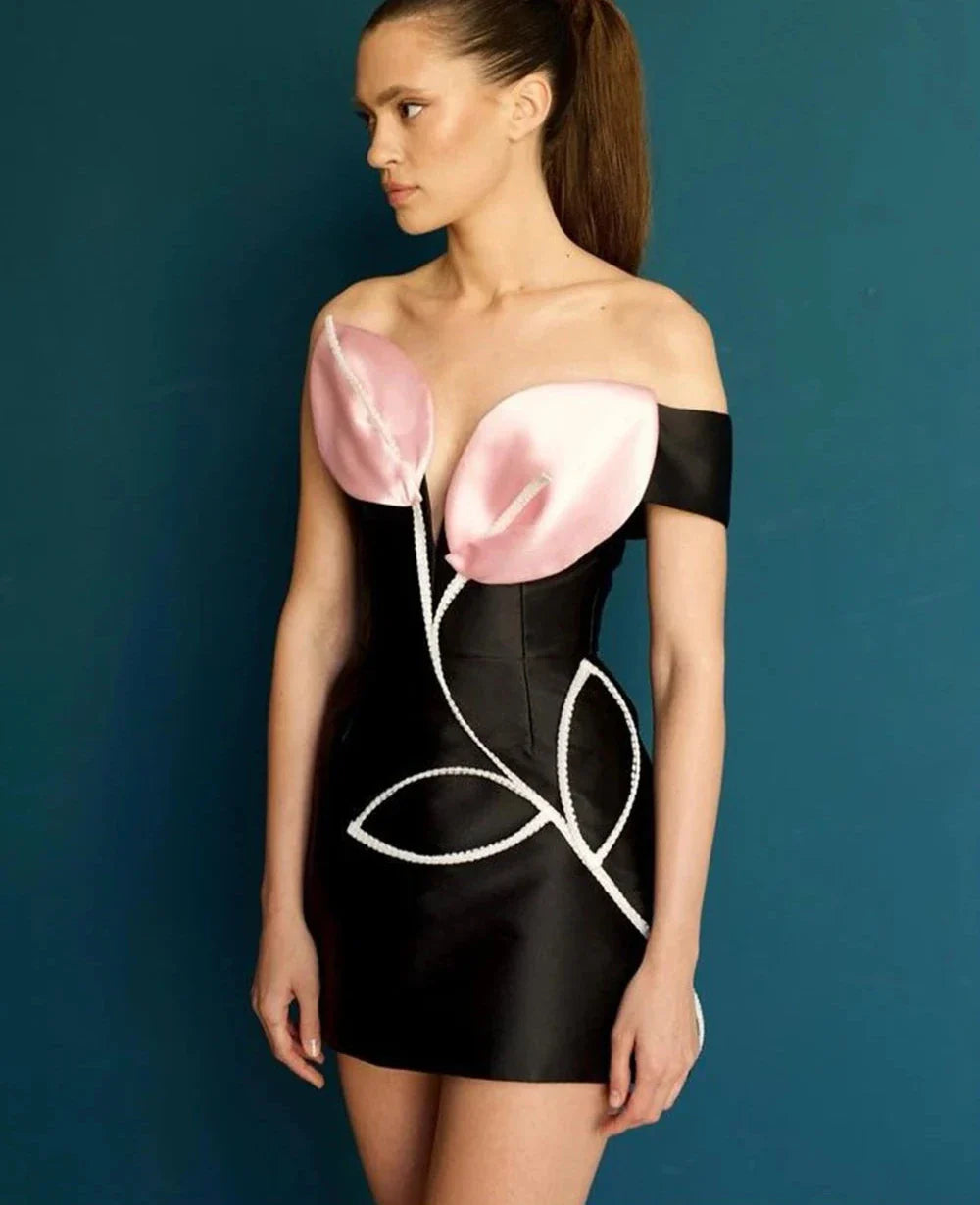 Diamond Appliques Off Shoulder Black Mini Dress