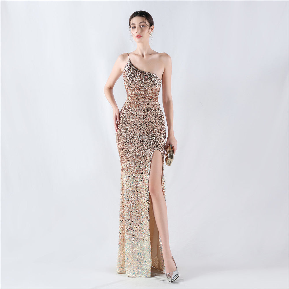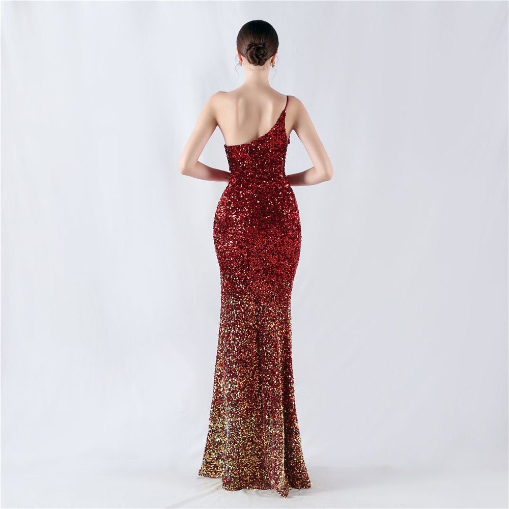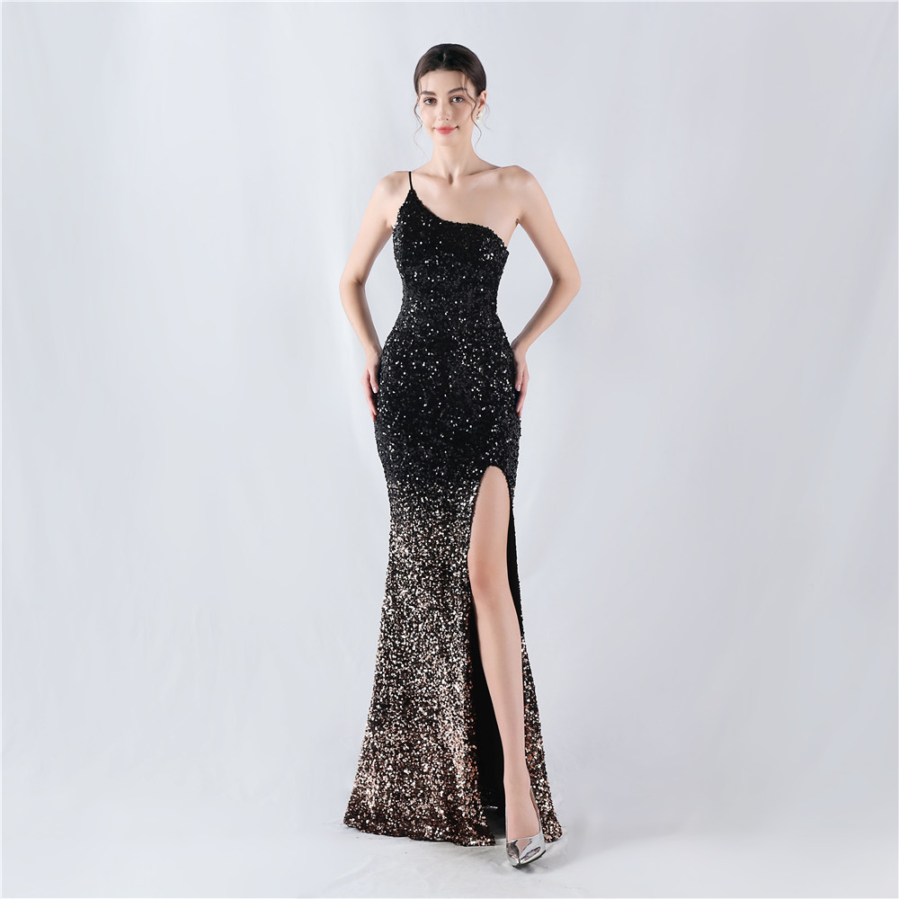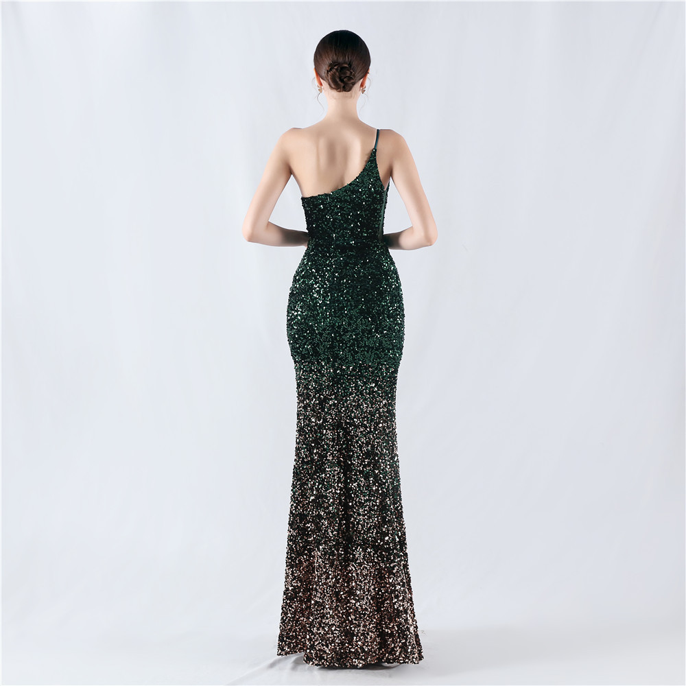 Vestido de noche de terciopelo con hombros oblicuos y lentejuelas degradadas en la parte inferior