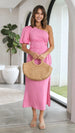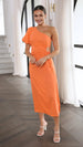 Vestido elegante de moda con hombros oblicuos, mangas abullonadas y abertura lateral
