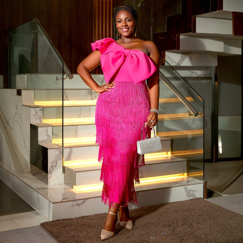 Elegante vestido de fiesta de cóctel con borlas y cuello diagonal y lazo grande en color liso