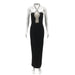 Exquisito vestido ajustado con escote halter y abertura en el bajo con diamantes de imitación para cenas y pasarelas.