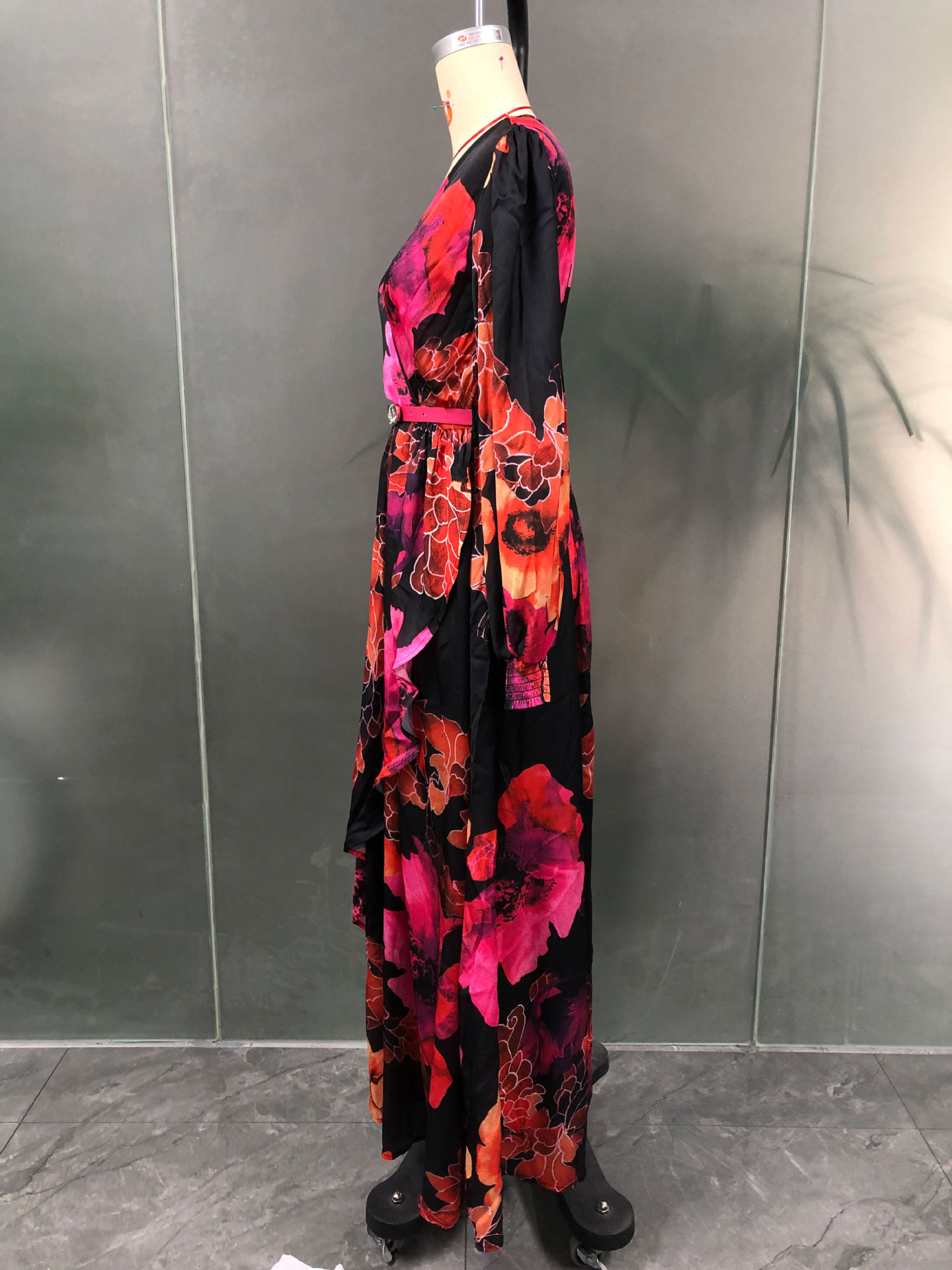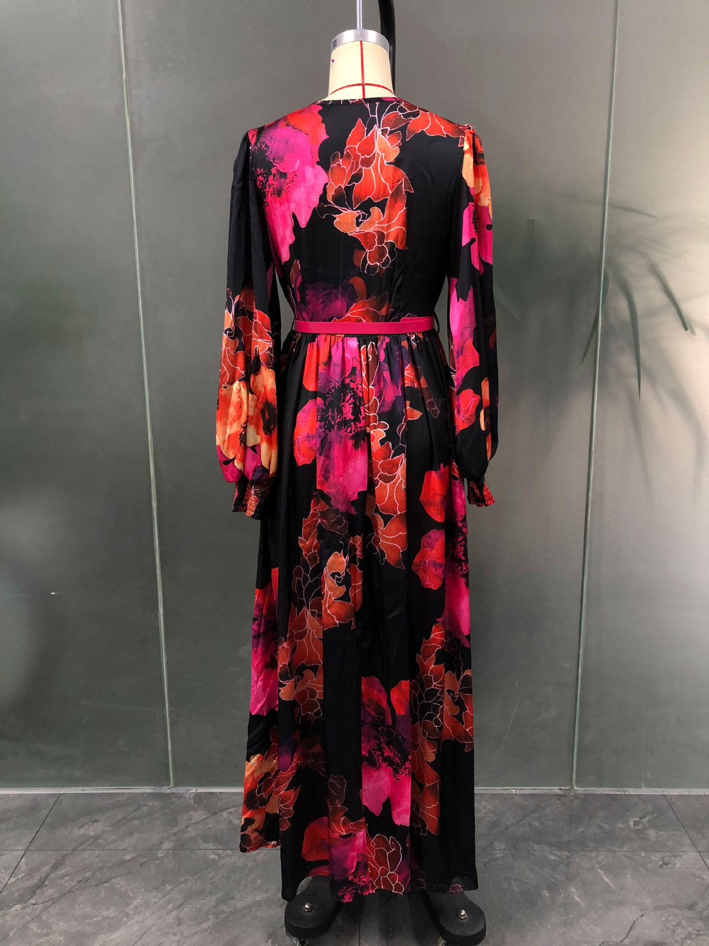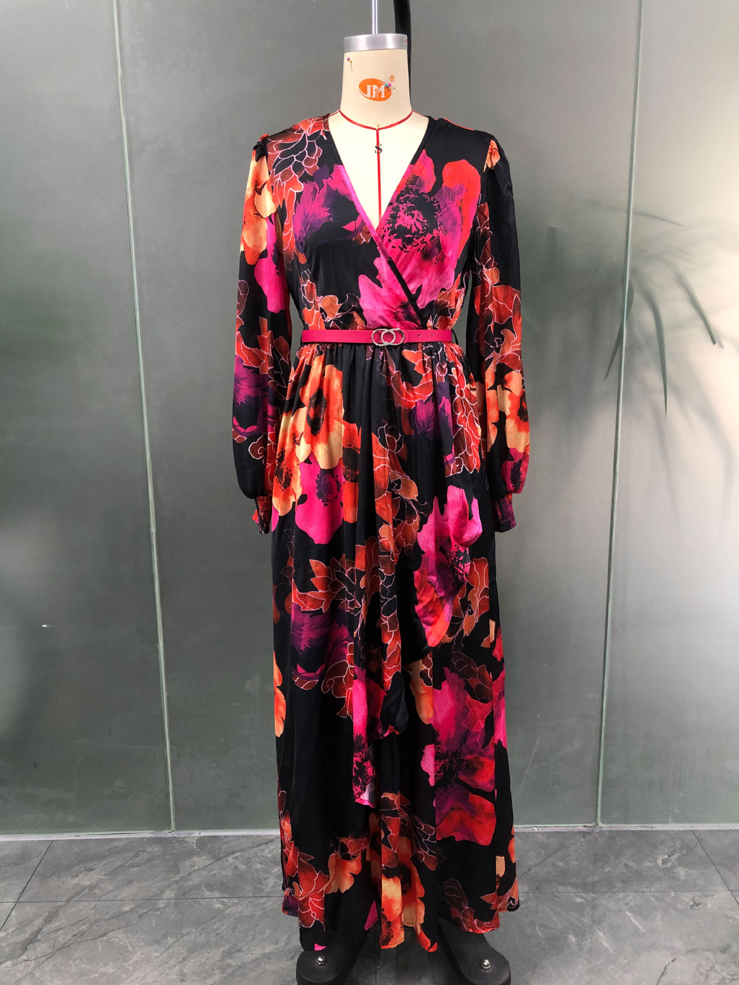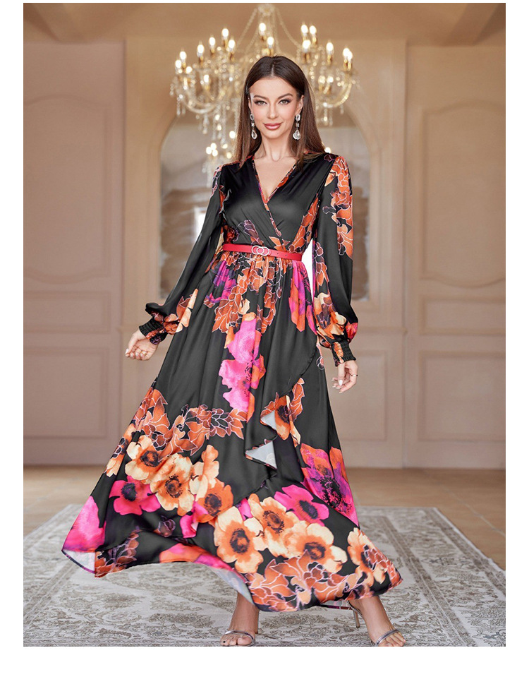 Vestido francés de talle alto con escote en V y gran vuelo con cinturón