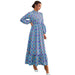 Vestido azul de manga larga y cintura alta con estampado retro y corte A