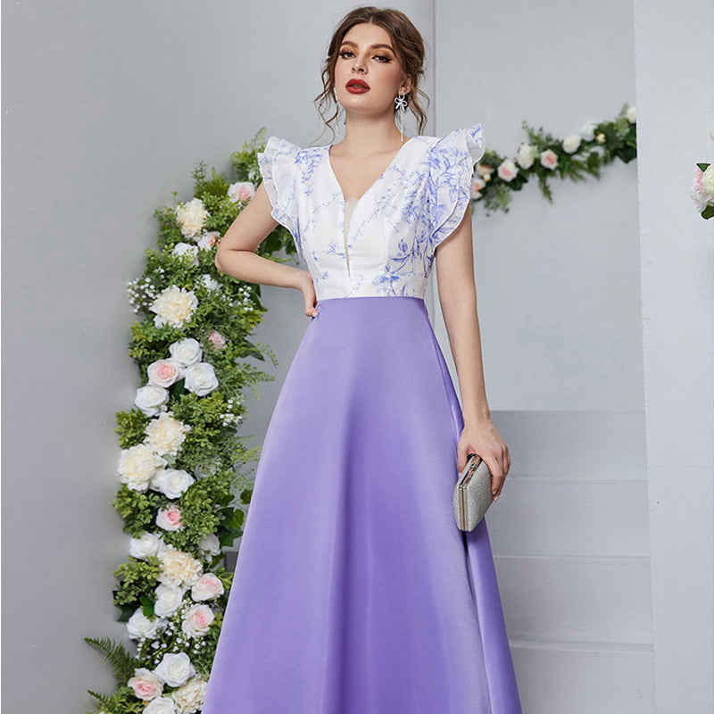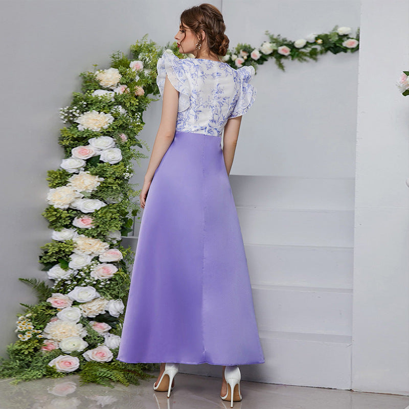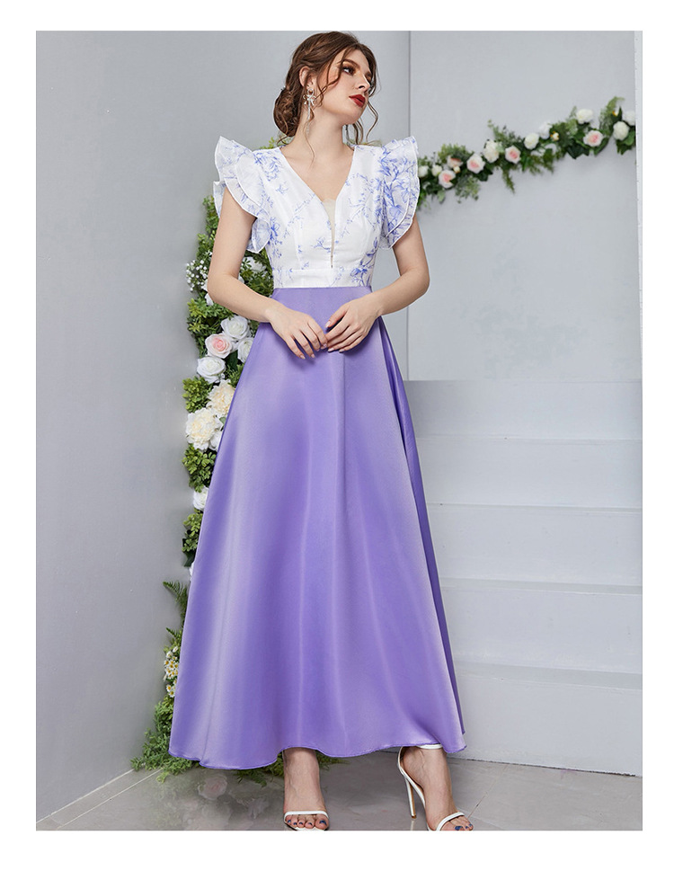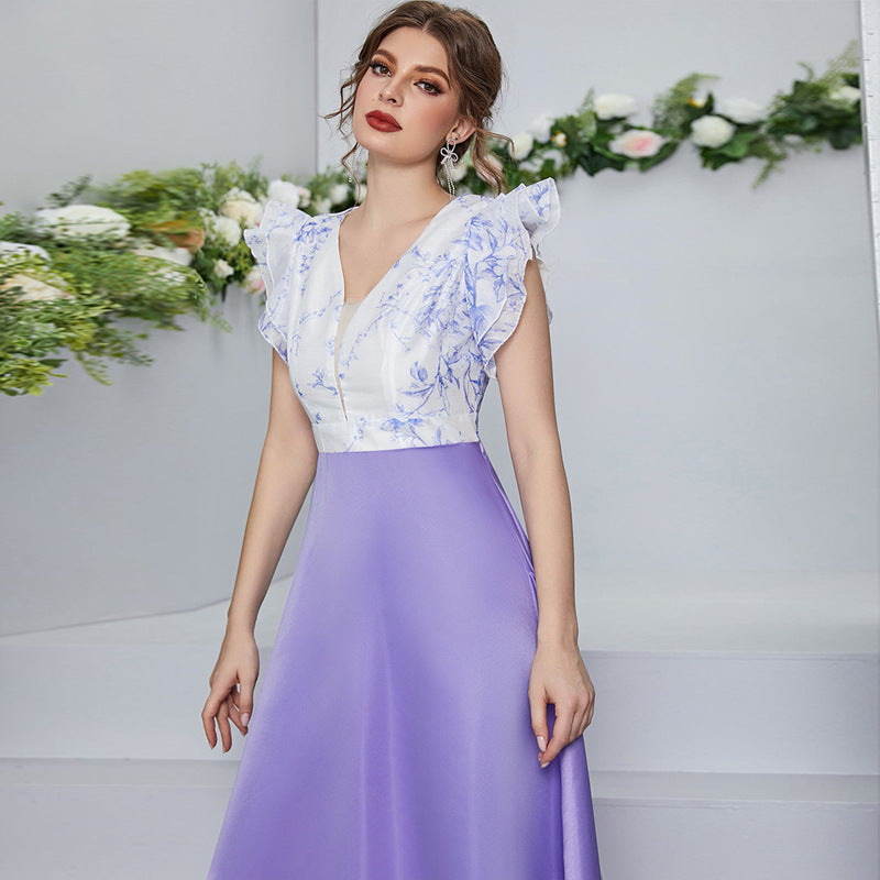 Vestido con estampado digital, escote en V, mangas pétalo y cintura alta