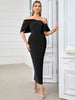 Vestido elegante asimétrico con pliegues irregulares y mangas en los hombros.