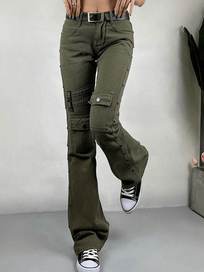 Diseño: bolsillos funcionales. Cierre de cremallera y botón. Cintura alta. Los vaqueros acampanados lavados con decoración metálica de Amiemi son un básico de moda que nunca pasa de moda. Con su corte relajado y cómodo, se adaptan a todo tipo de siluetas y combinan a la perfección con cualquier estilo. Ya sea que busques un look casual o más formal, estos vaqueros son la prenda ideal para tu armario. Nuestros vaqueros están confeccionados con denim de alta calidad para un look atemporal y duradero.