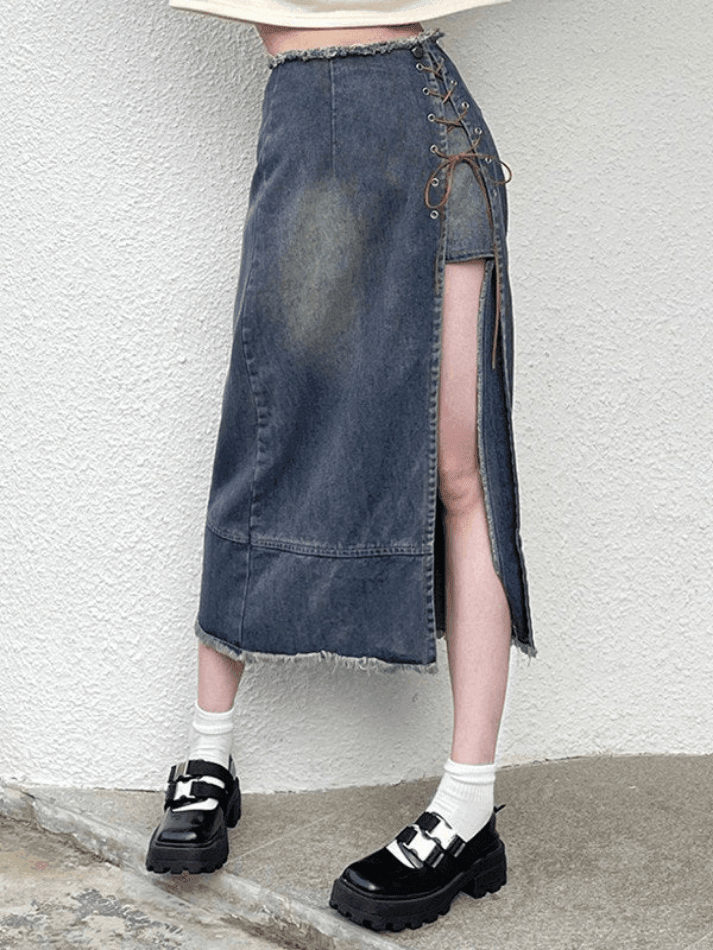 Diseño: Esta falda vaquera punk chic tiene detalles parcheados con un lazo entrecruzado en la parte delantera. presenta un diseño de pierna dividida. con bordes deshilachados sin rematar. costuras plisadas y un botón de metal adornado.