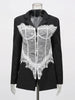 Indulge in the ultimate power piece with our Lace Corset Blazer. The black lace detailing adds a touch of sophistication to this exclusive blazer. Its corset-style structure cinches your waist, creating a sleek silhouette. Make a statement with this luxurious and timeless piece.
