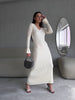 Vestido largo de lana de canalé de color liso con cuello en V y manga larga de punto ajustado