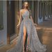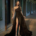 Vestido largo con hombros descubiertos y abertura, vestido tostado, vestido de noche con lentejuelas
