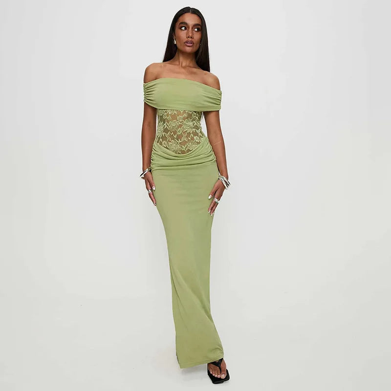 Off-shoulder Strapless Green Lace Sheer Long Dress