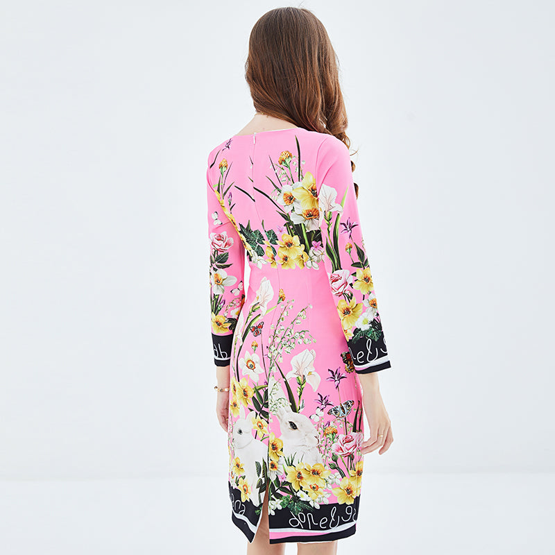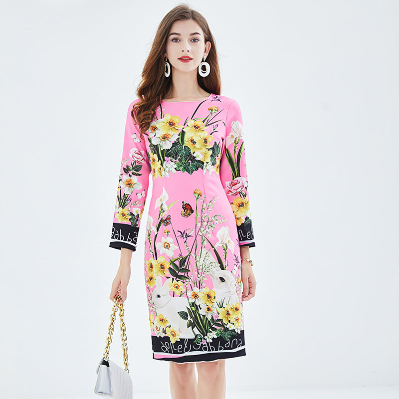 Vestido elegante de cintura alta y cadera con estampado de posicionamiento, vestido de cuello redondo y manga larga con cintura alta