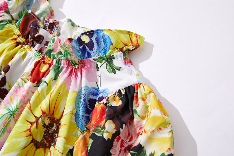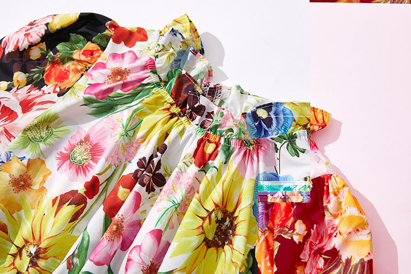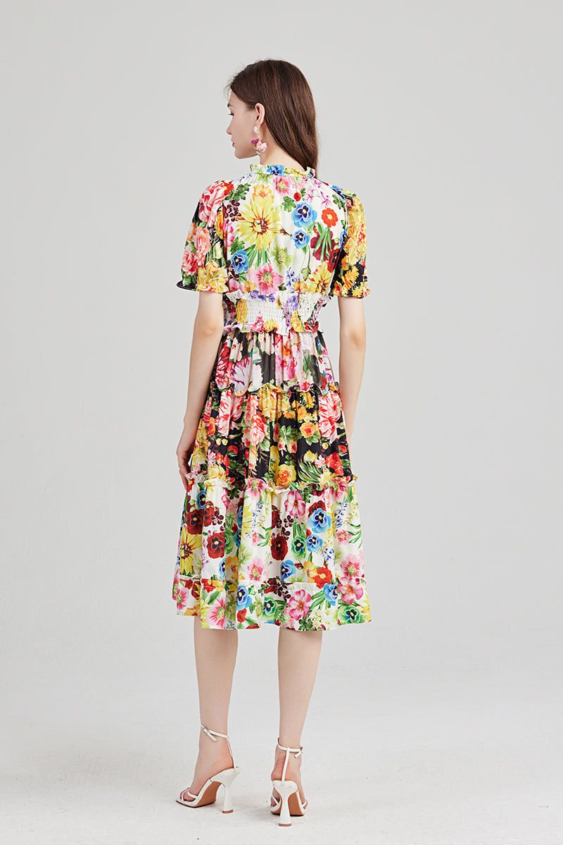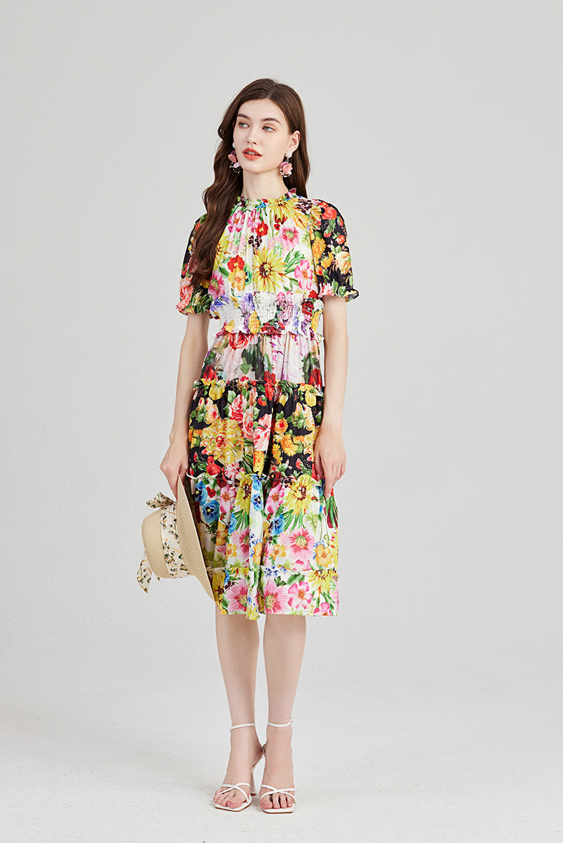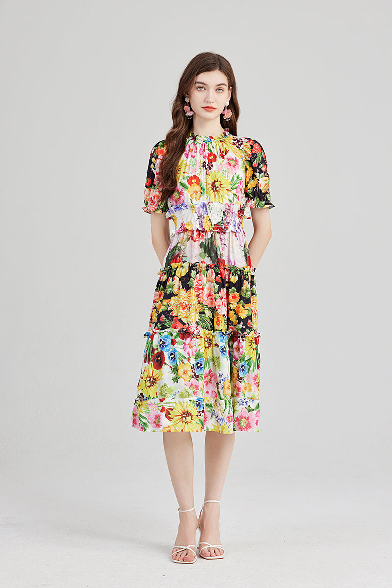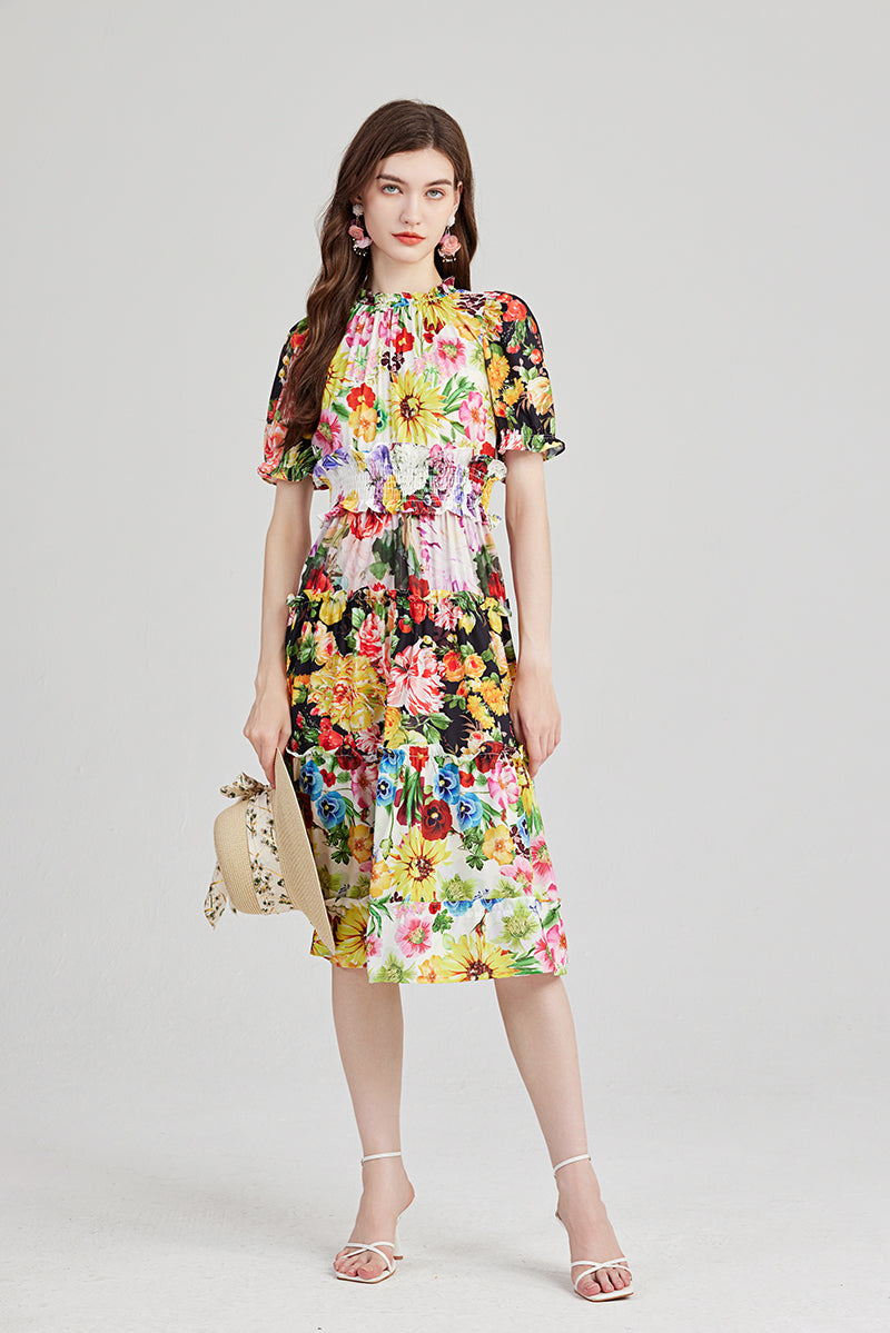 Vestido ajustado de manga corta con cuello alto, cintura alta y cordón de goma con estampado de hojas de loto en contraste