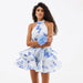 Vestido corto ajustado con cuello halter, espalda descubierta y estampado