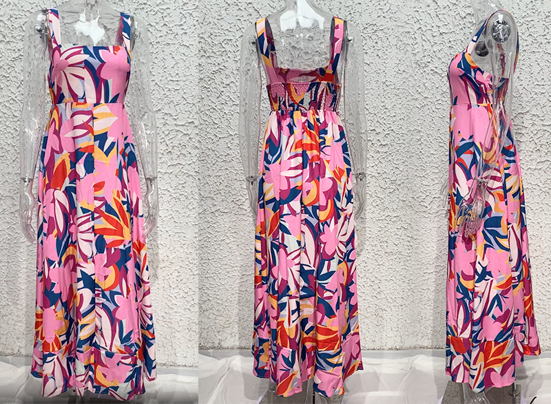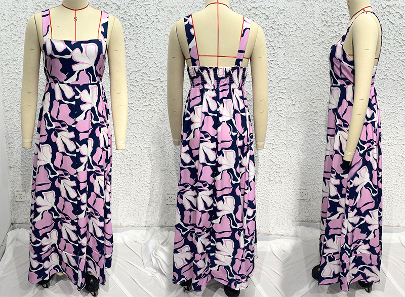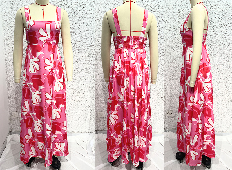 Vestido largo adelgazante con tirantes estampados y espalda descubierta