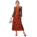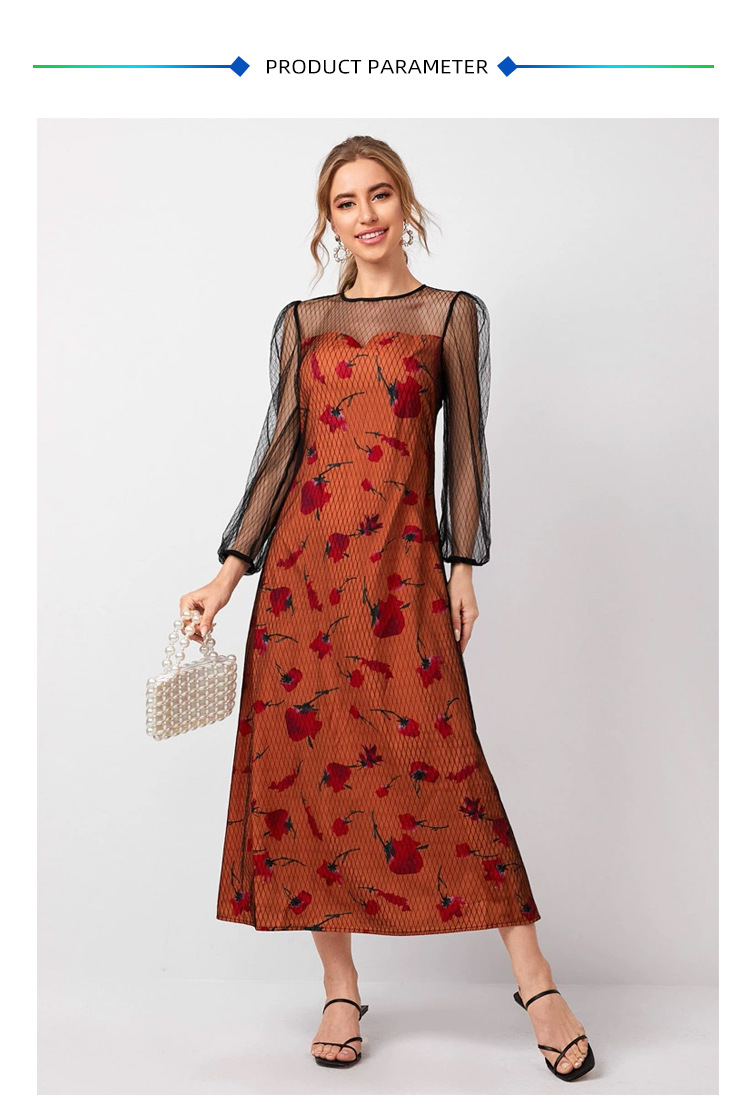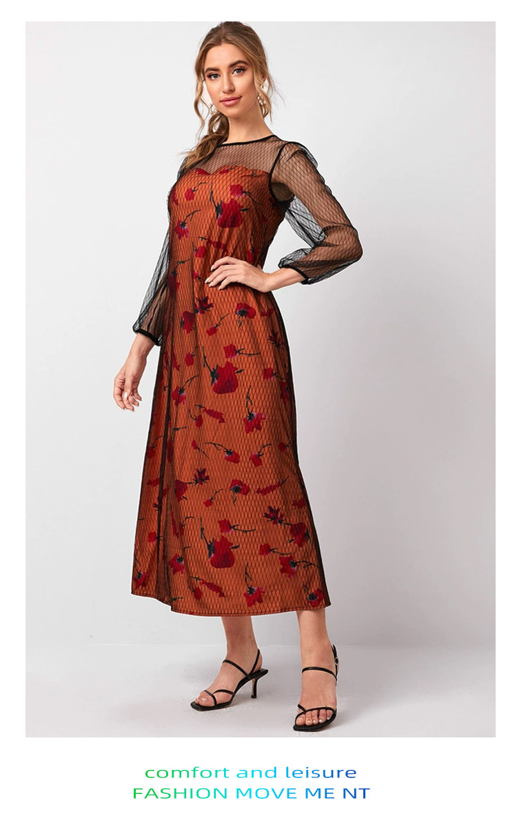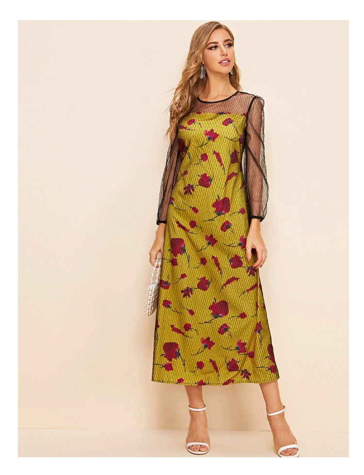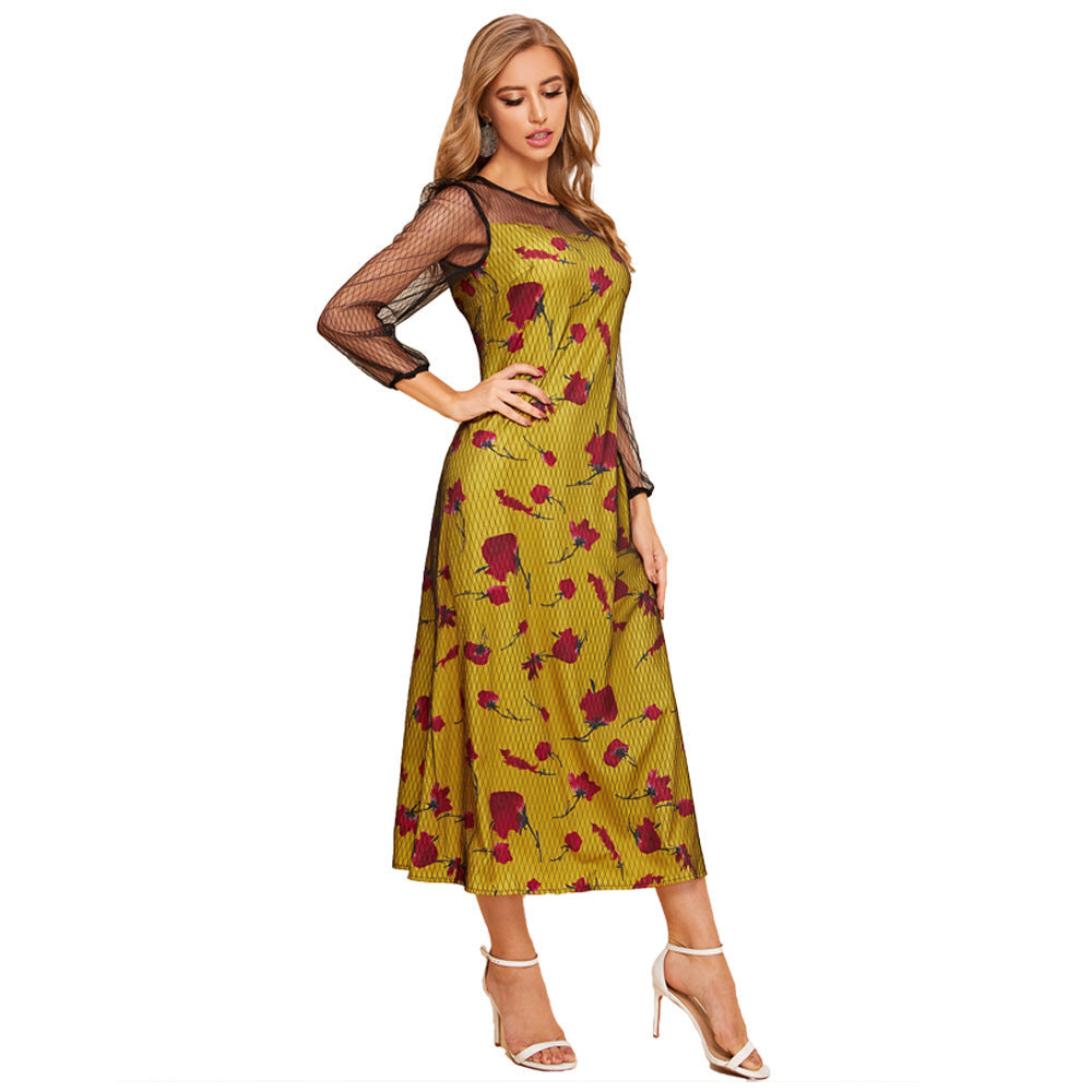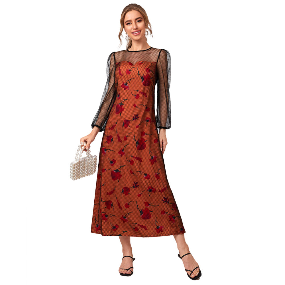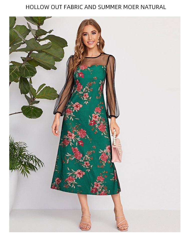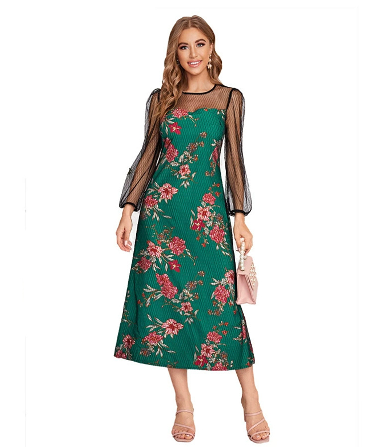 Vestido elegante de cuello redondo, manga larga, cintura elástica y patchwork
