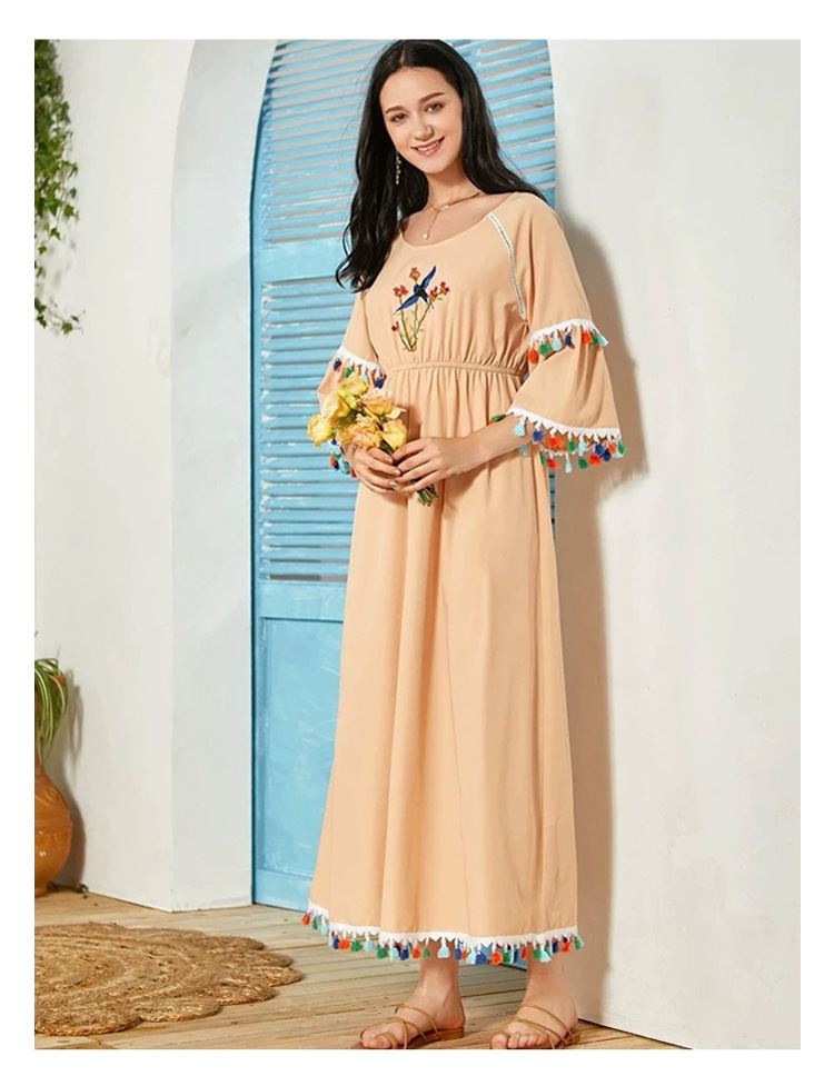 Vestido informal largo de cintura alta con cuello redondo y borlas, media manga