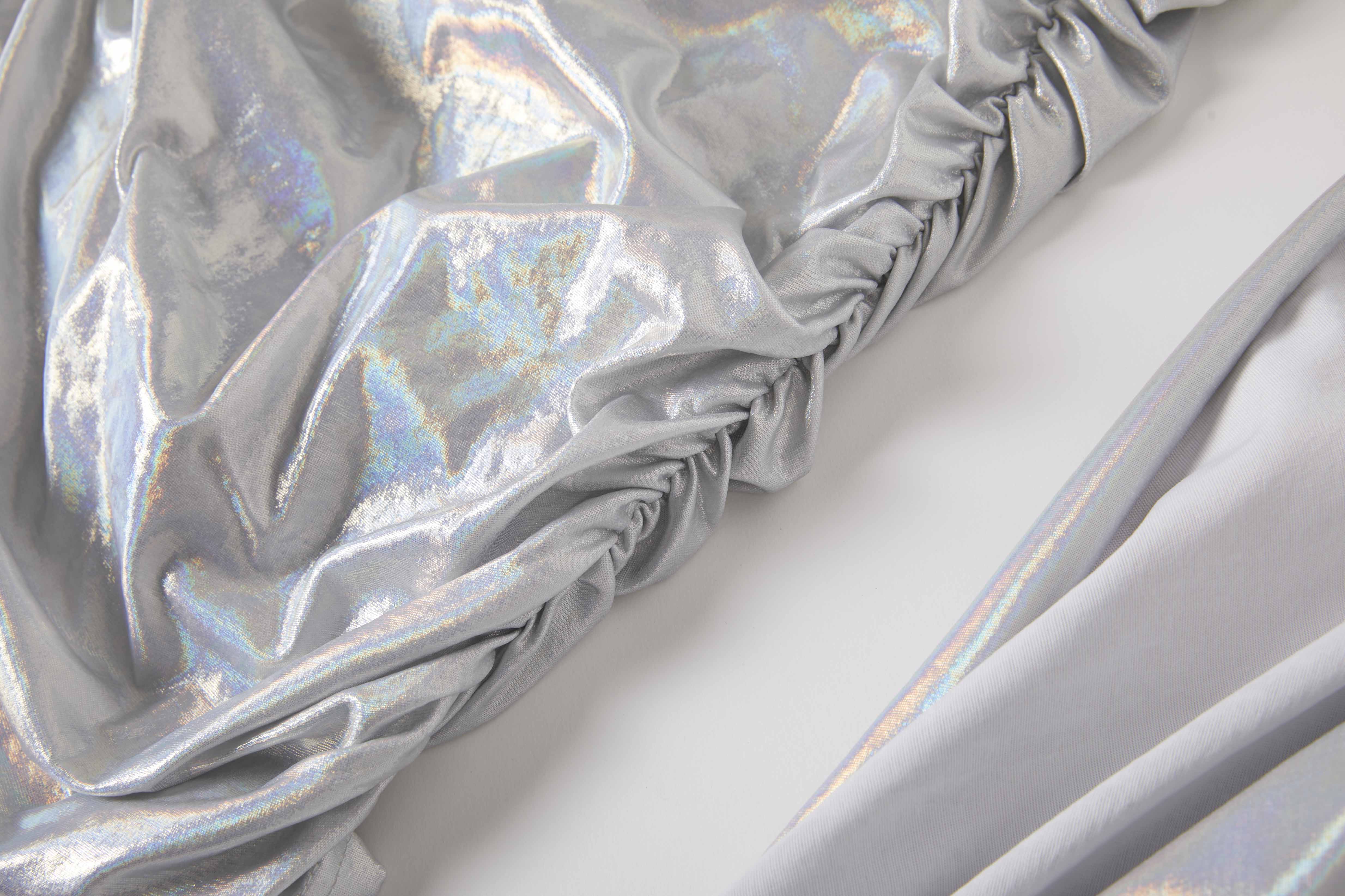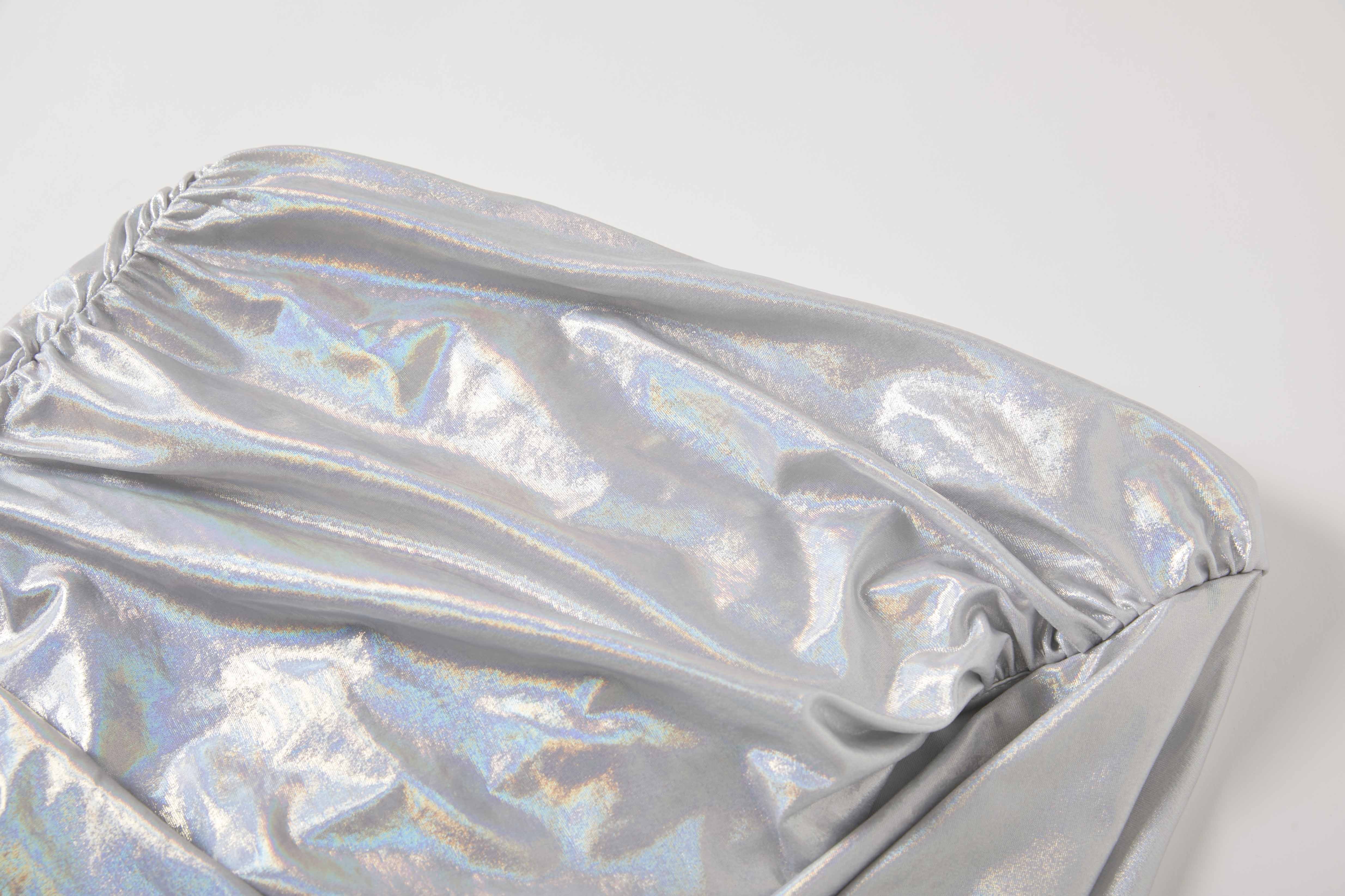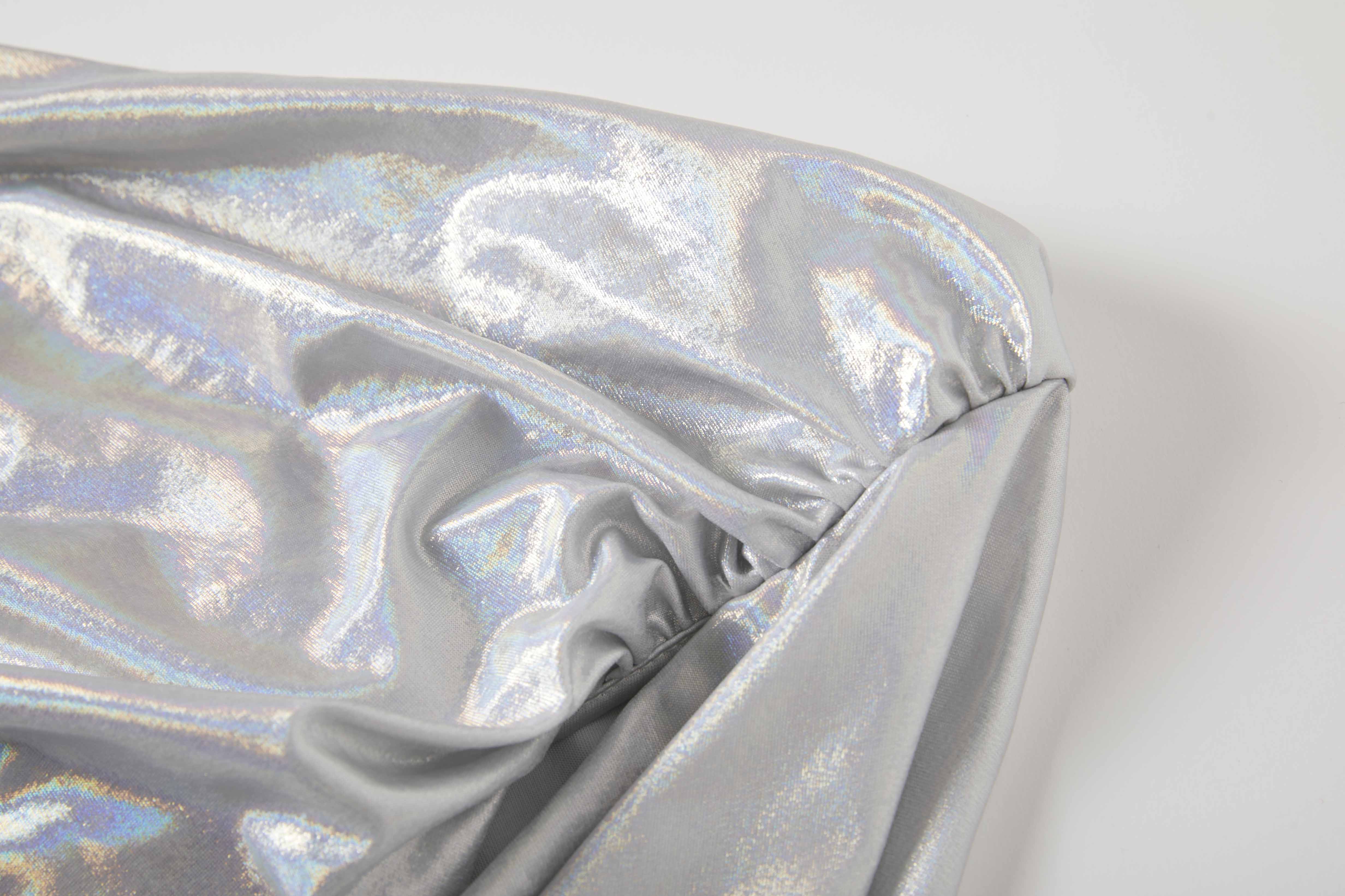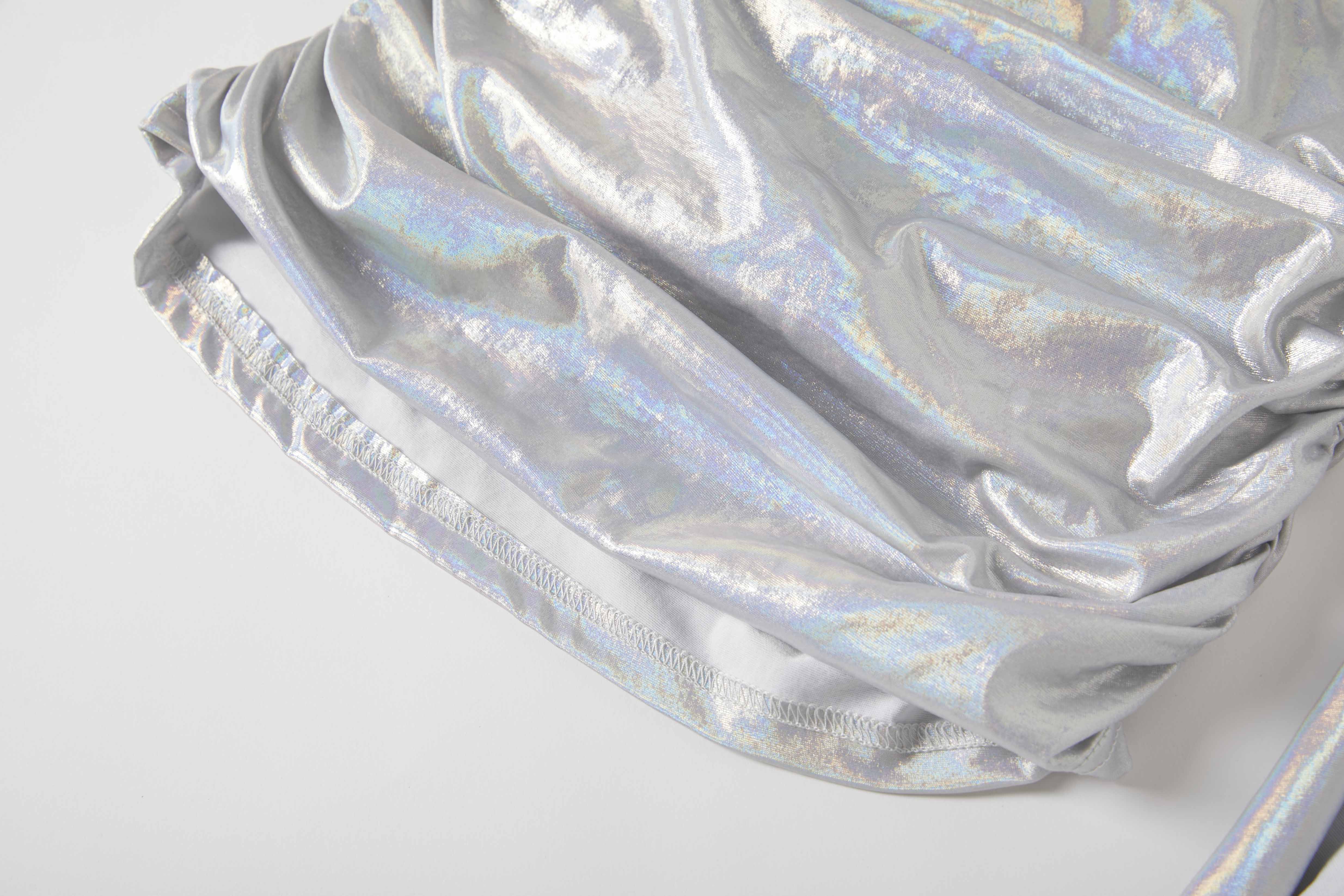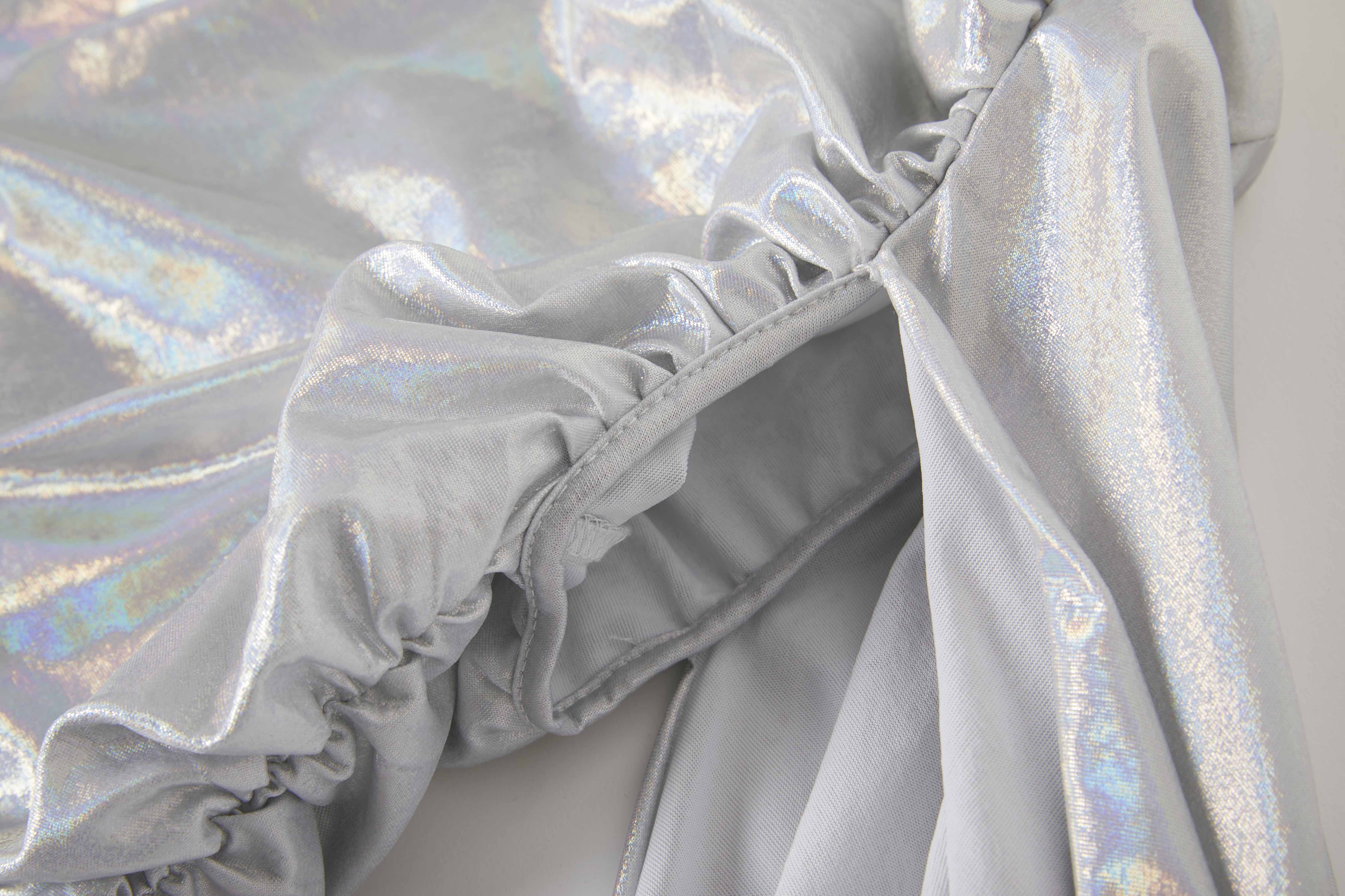 Vestido plateado de corte entallado, plisado, asimétrico y con hombros inclinados