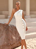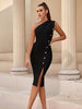 Vestido de una pieza con hombros al aire y vendaje, ajustado, adelgazante, con botones y abertura.