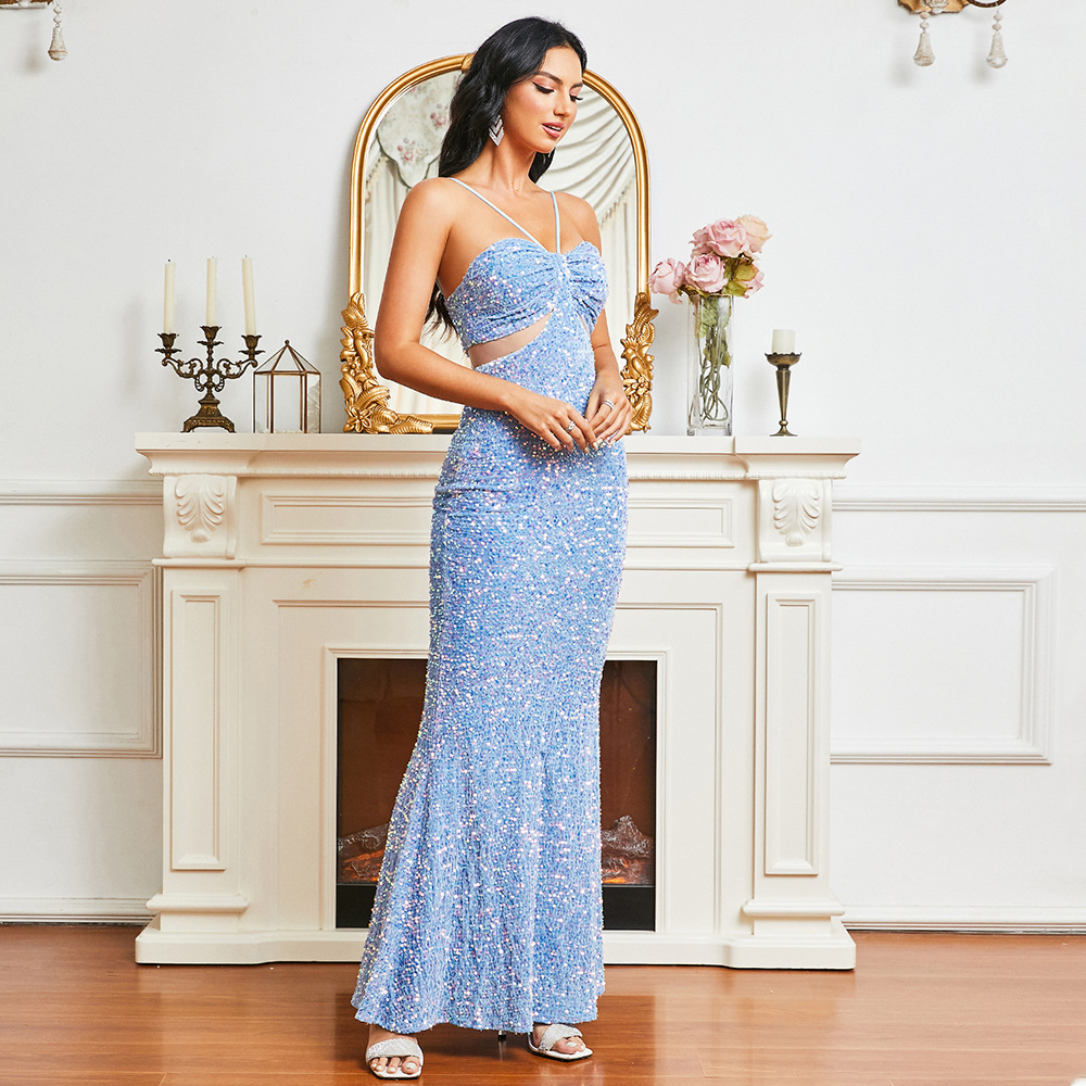 Vestido de cóctel de noche elegante, sin mangas, largo, con lentejuelas, cuello halter y espalda descubierta para dama de honor