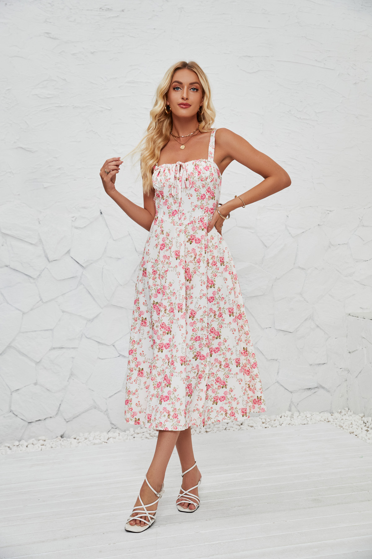 Vestido largo elegante estilo pastoral con tirantes florales