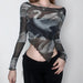 Sumérgete en la vanguardia de la moda con nuestro elegante top asimétrico de malla con gráfico de cisne negro. Diseñado para la mujer moderna, este estilo corto luce un ingenioso gráfico de cisne, delicados volantes y malla de poliéster transpirable. Su singular asimetría promete una declaración audaz. Combínalo con pantalones elegantes para una estética inigualable.