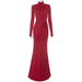 Vestido de cola de pez con cuello alto, manga larga, hombros acolchados y plisado a la cadera