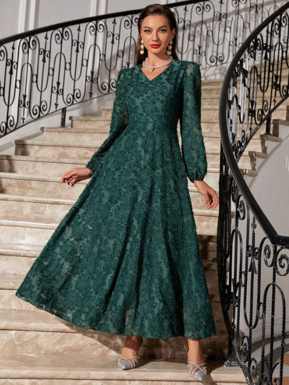 Vestido elegante de corte A con escote en V, manga larga, cintura perlada y estampado oscuro