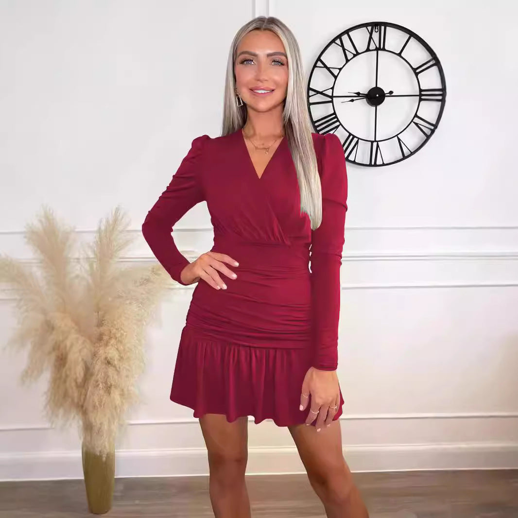 Use un vestido de manga larga con cuello en V y plisado ajustado a la cadera.