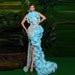 Women Blue Ruffles Mermaid Lace Side Split Prom Dress