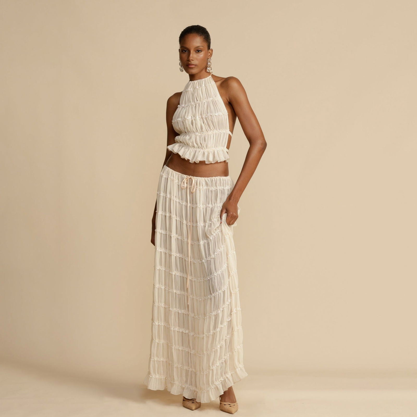 Backless Lace up Halterneck Sling Top Suit Wooden Ear Pleated Dress Two Piece Set