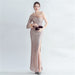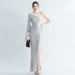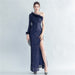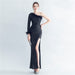 Craft Ostrich Feather Decorative Diagonal Shoulder Roman Collar Side Slit High End Evening Dress
