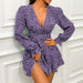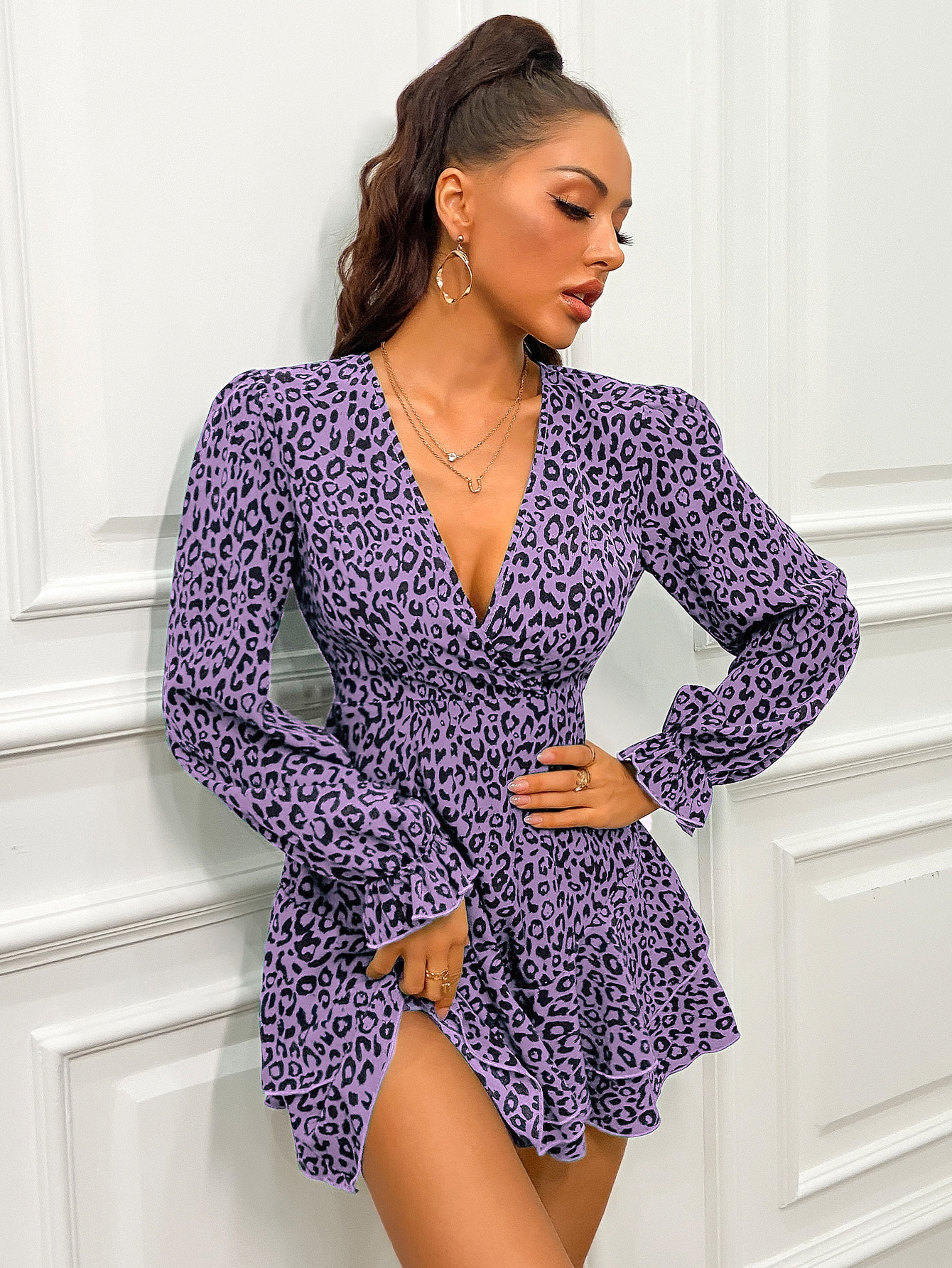 Deep V Plunge Backless Leopard Print Ruffled Dress