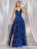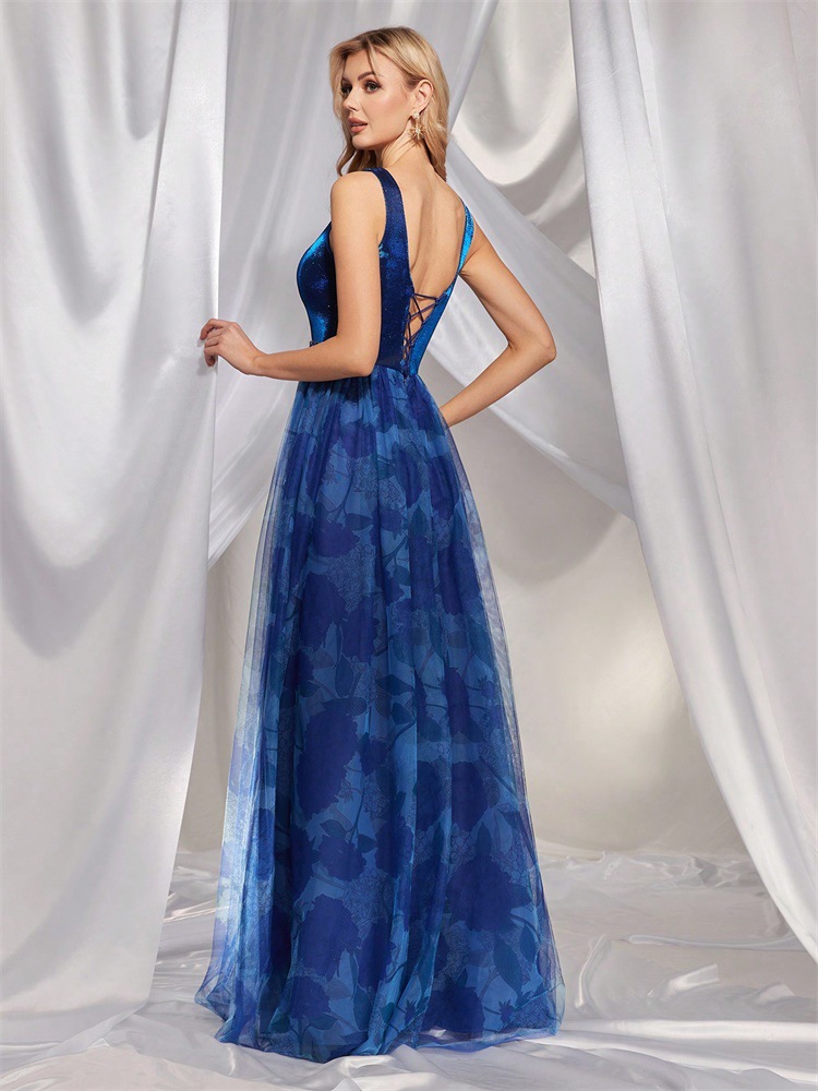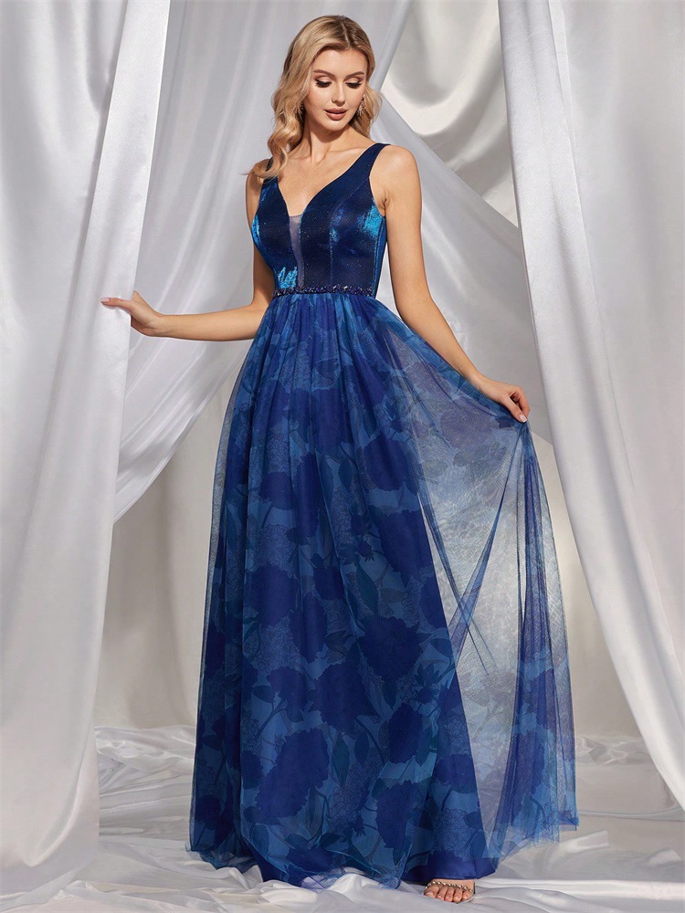 Deep V Plunge Floral Print Stitching Rhinestone Ornament High Slit Dinner Dress Bridesmaid
