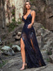 Deep V Plunge Sling Translucent Bare Back Lace Up Sequined Maxi Dress