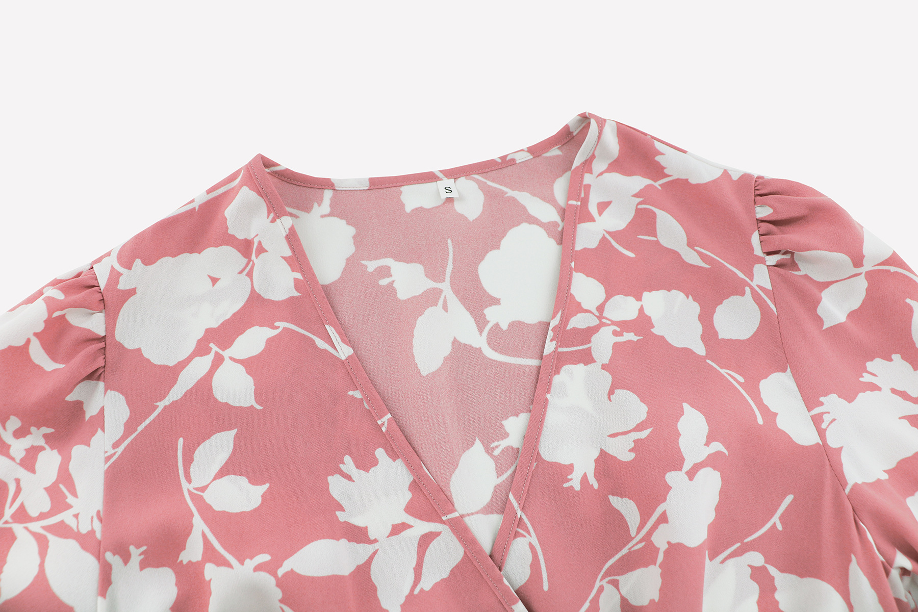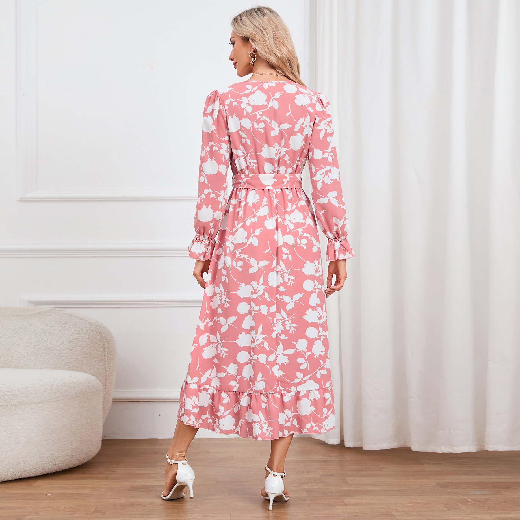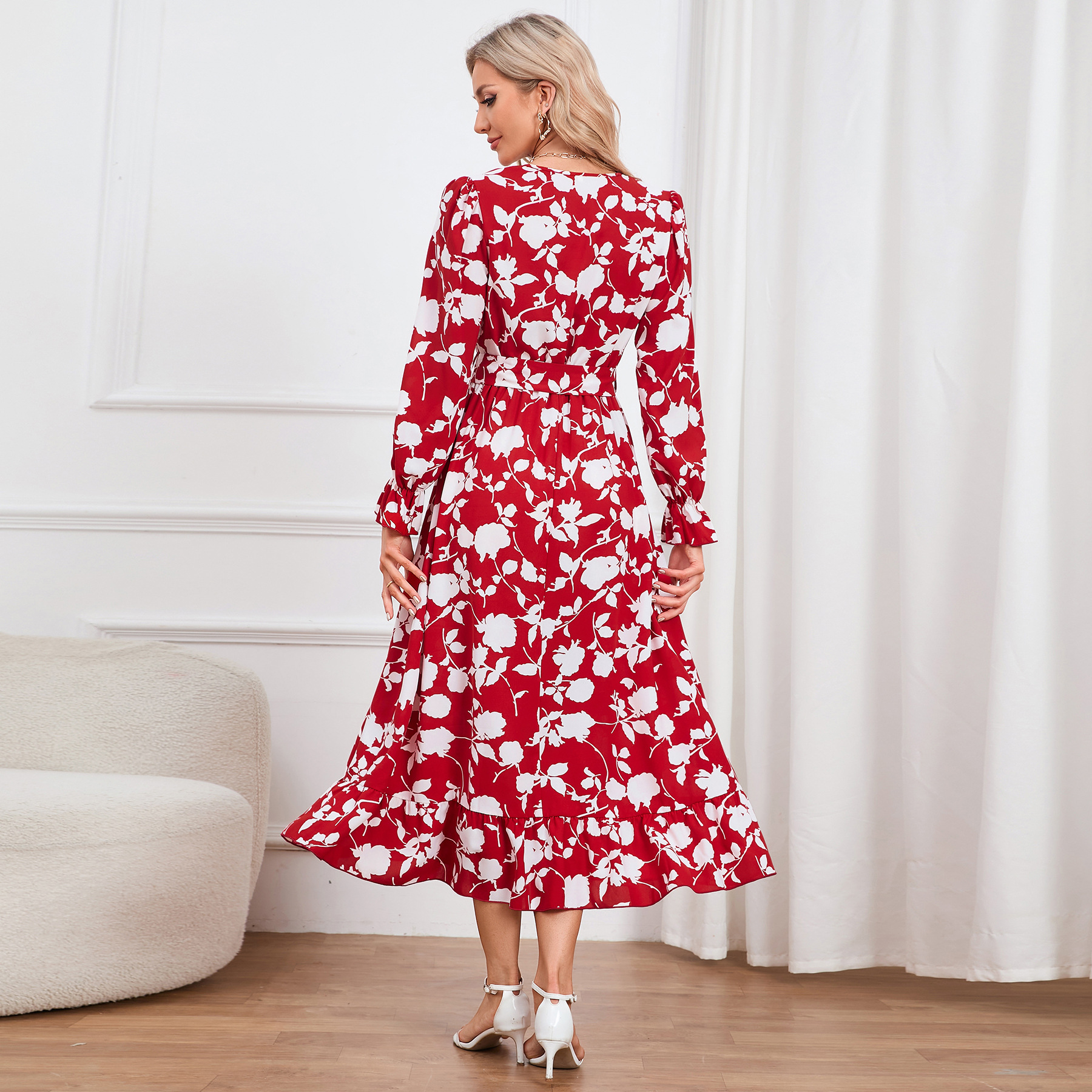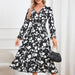Dopamine Retro V Neck Printed Dress Large Swing Waist Dress