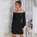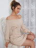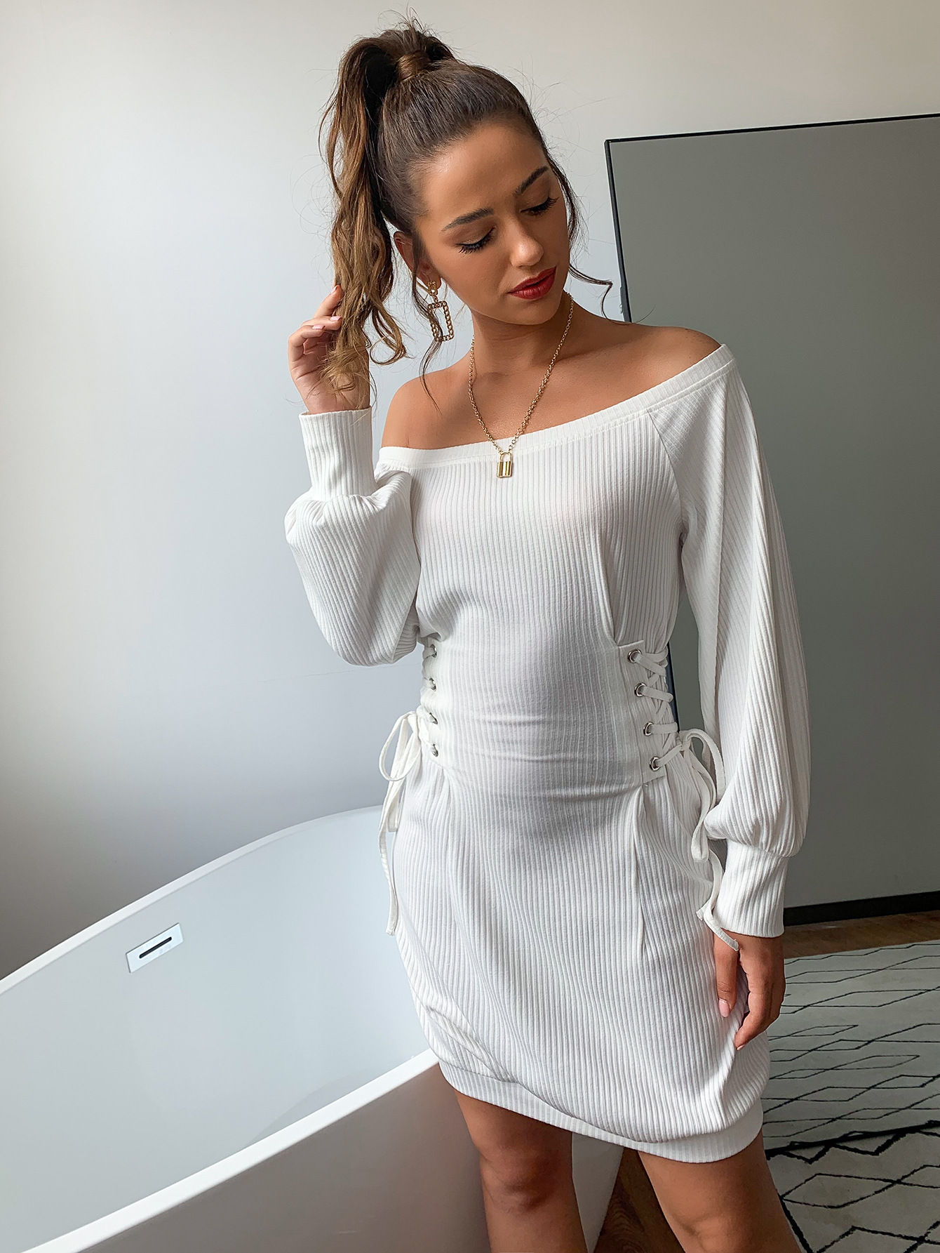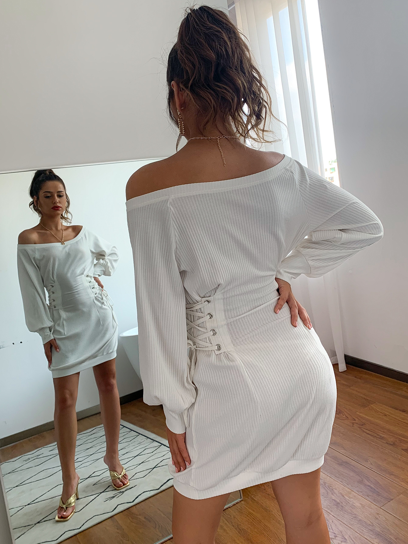 Dress off Shoulder Waist Belt Puff Sleeve Knitted Office Dress