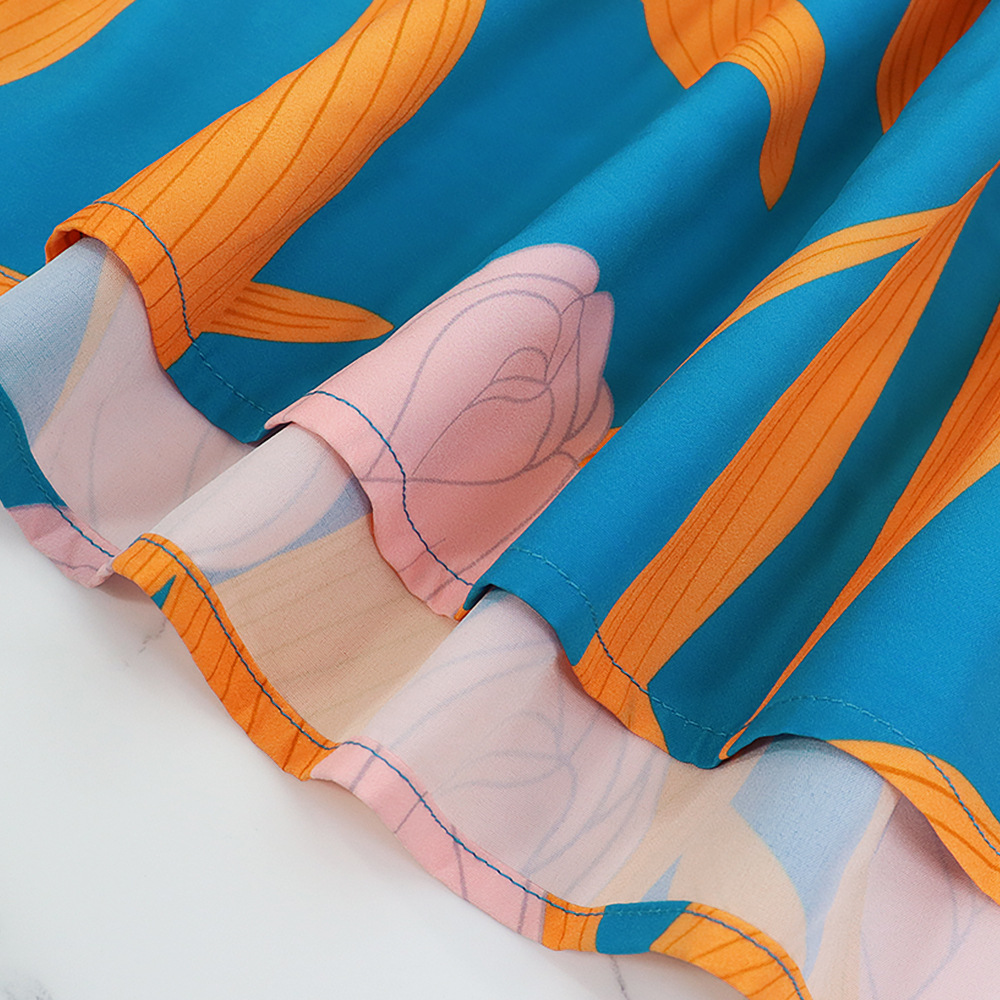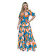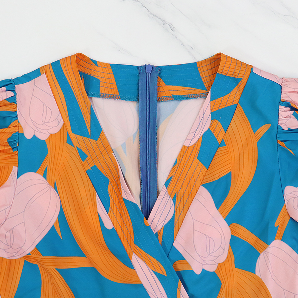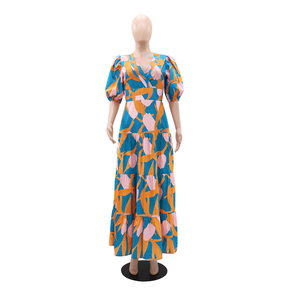 Dress Puff Sleeve V neck High Waist Maxi Dress Art Print Stitching Dress