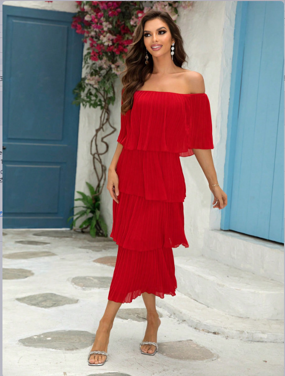 Elegant Boat Neck Pleated Ruffled Dress Maxi Dress