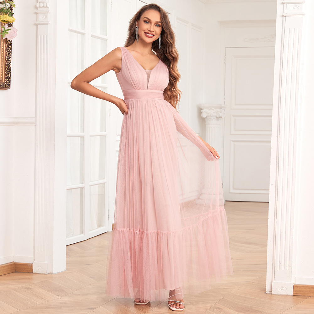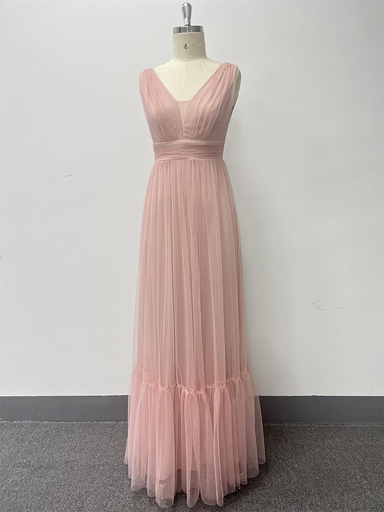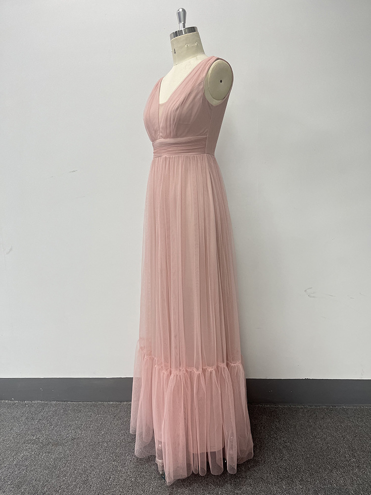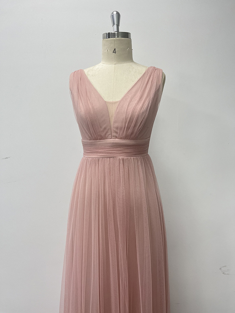 Elegant Double V neck Sleeveless Tulle Full Lining Evening Dress A line Puffy Tulle Wedding Bridesmaid Party