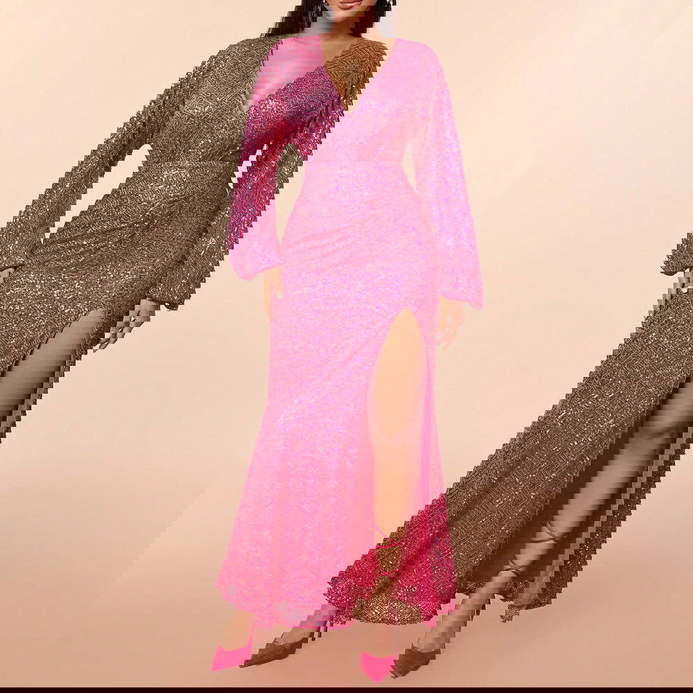 Elegant Dress Sequ Deep V Plunge Split Long Sleeve Maxi Dress